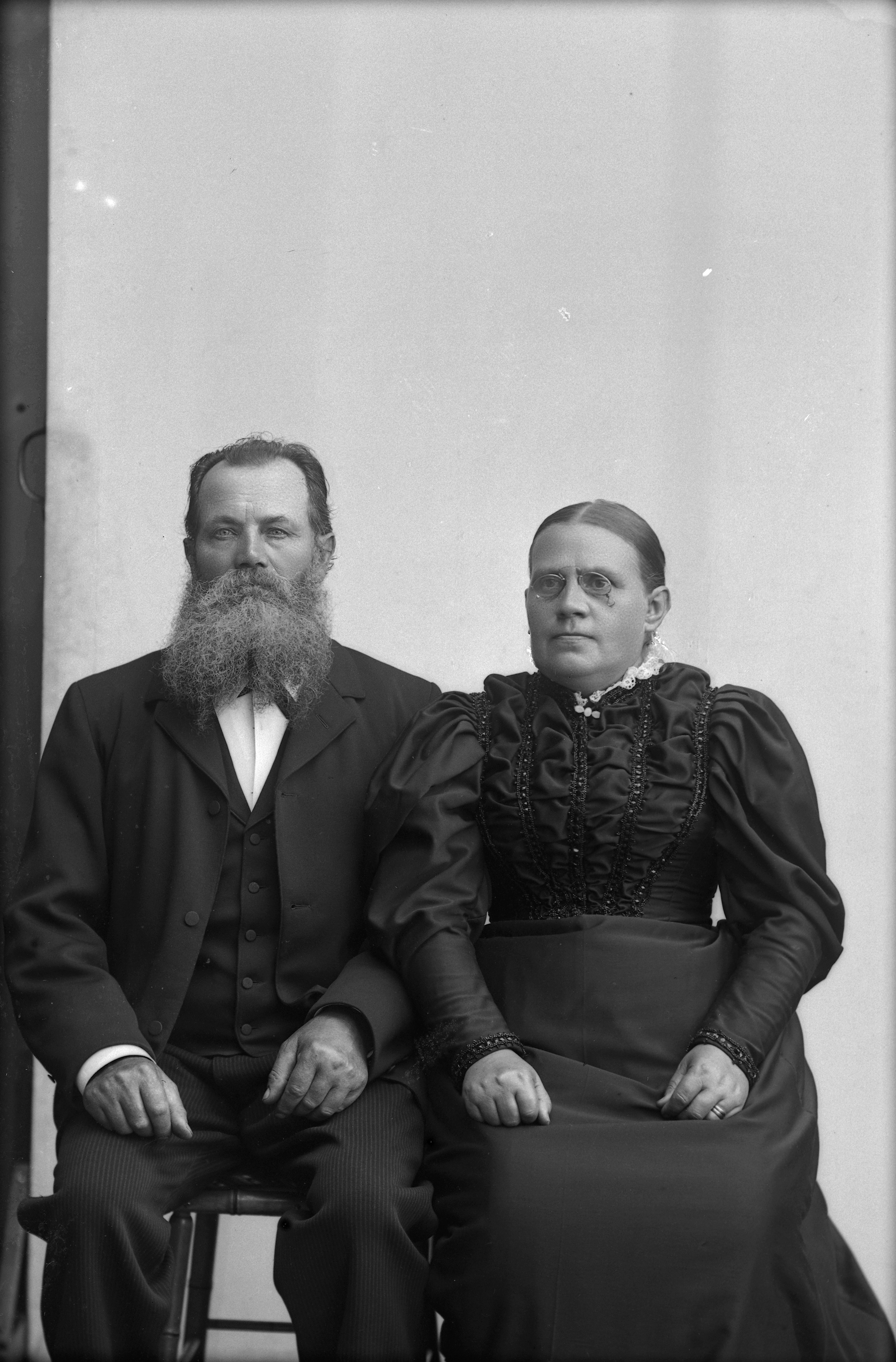 Beskrivning: Porträtt i helfigur av herr Paulsson med fru.