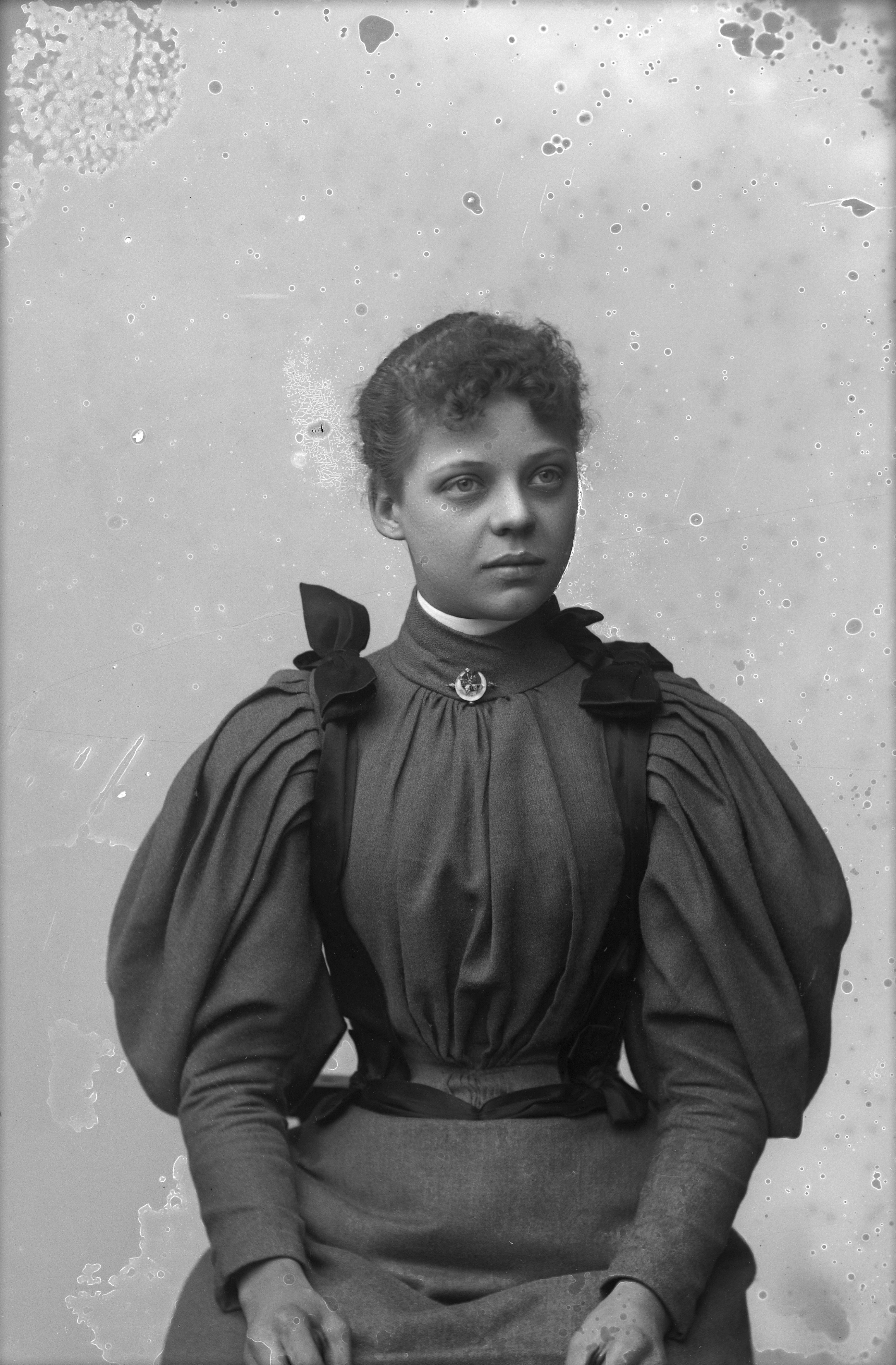 Beskrivning: Porträtt i halvfigur av Hilda Erksson.