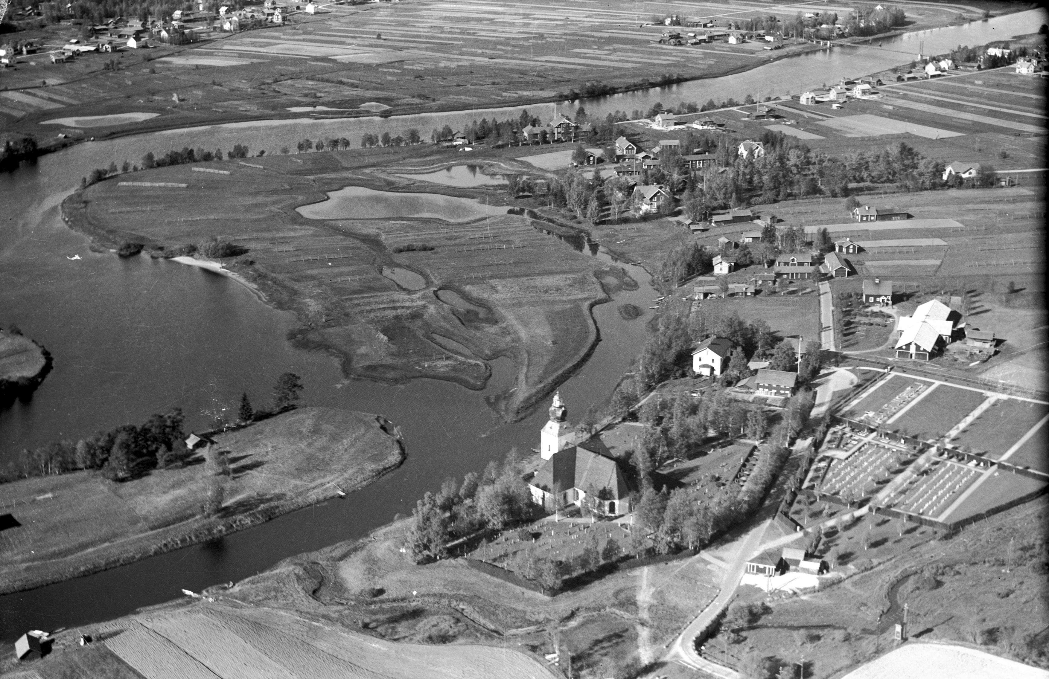 Kyrkan med omgivning. Flygfoto.