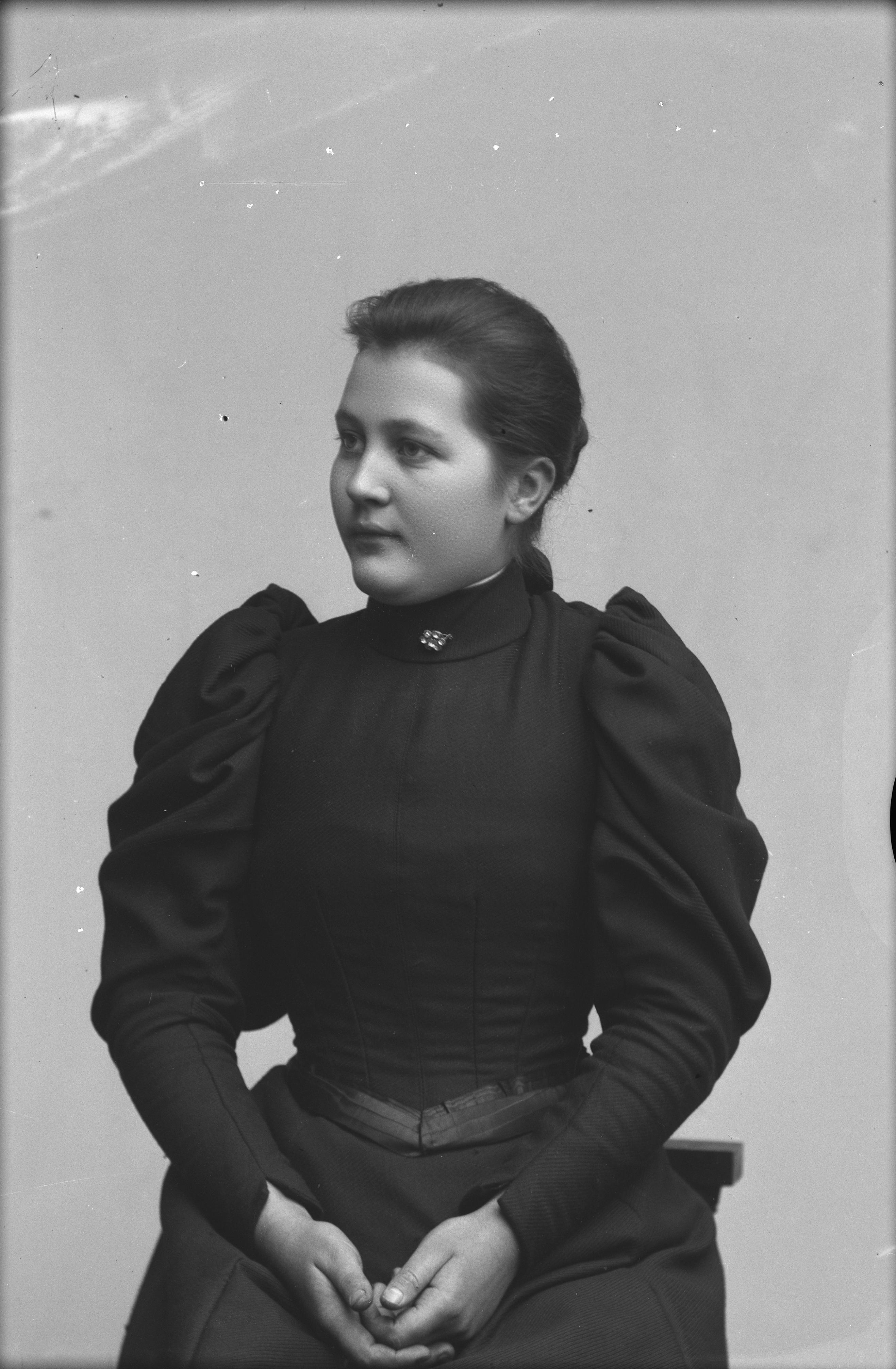 Beskrivning: Porträtt i halvfigur av Augusta Johansson.