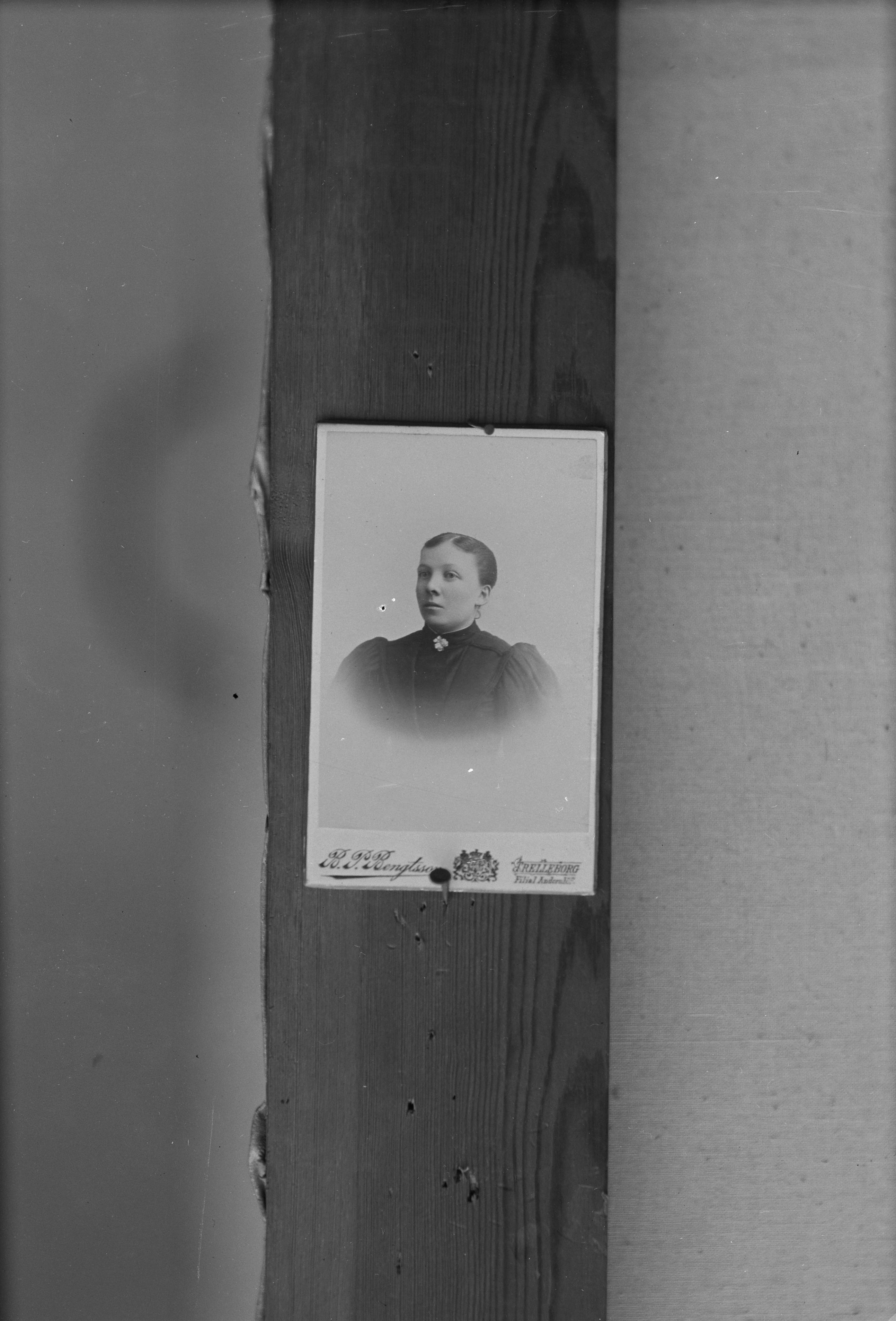 Porträtt i halvfigur av oidentifierad kvinna. Visitkort med ateljélogotyp, "B. P. Bengtsson /Trelleborg /Filial Anders Löv".