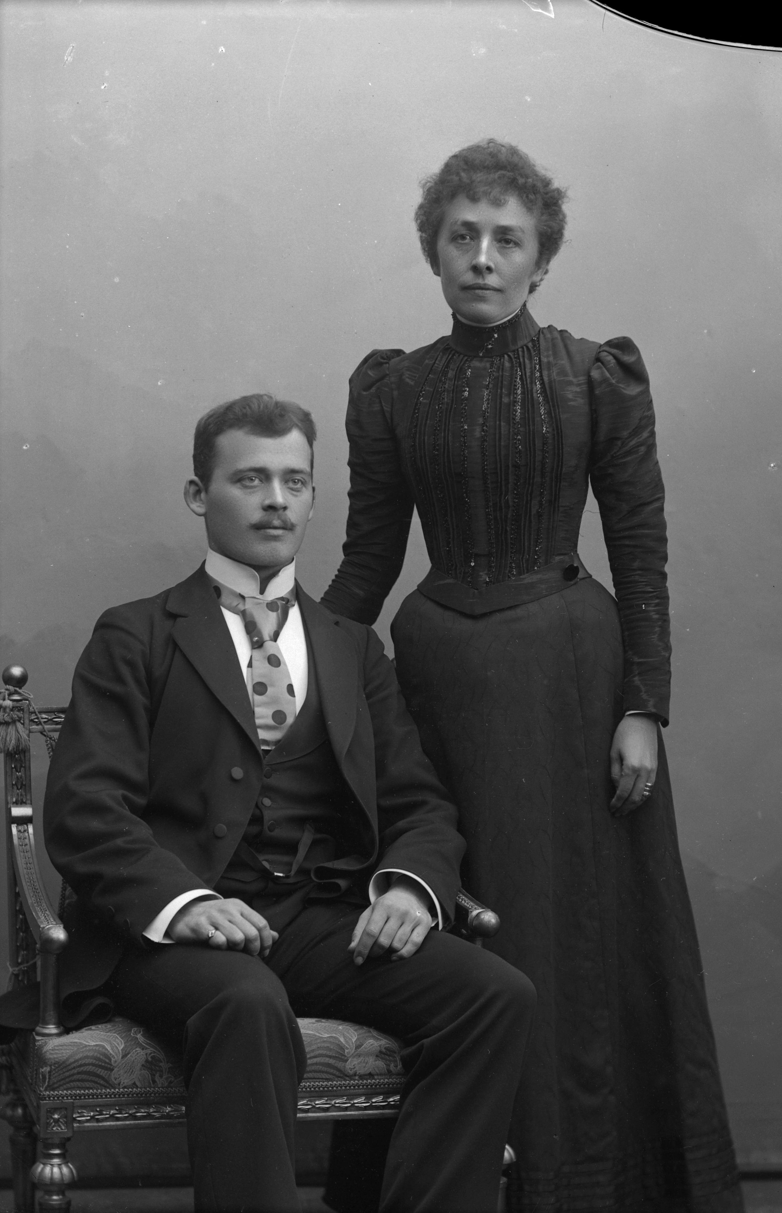 Beskrivning: Porträtt i helfigur av herr Olander med fru. Maken sittande i stol.