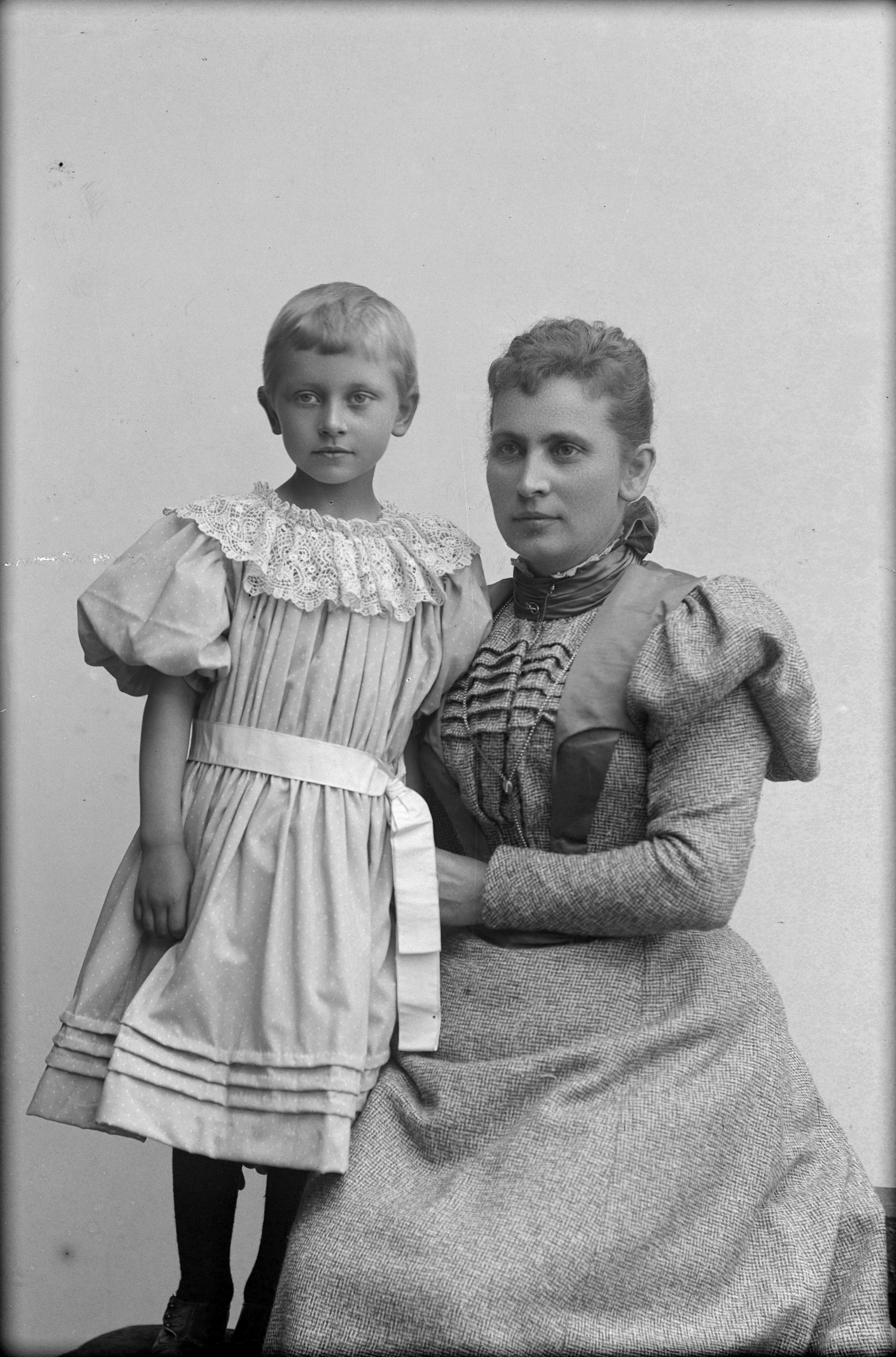Beskrivning: Porträtt i helfigur av fru Albrektsson med dotter.