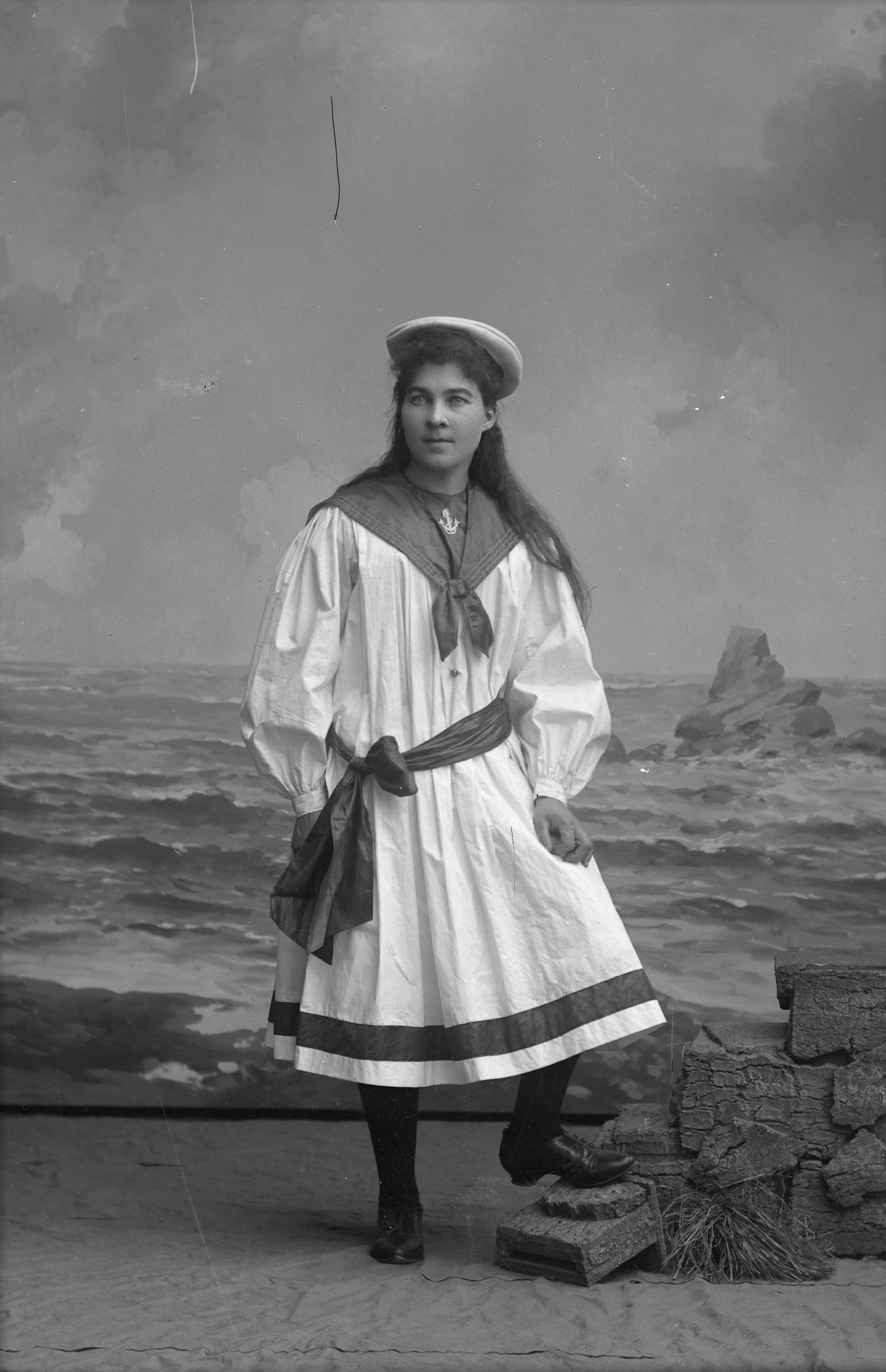 Porträtt i helfigur av Elin Nilsson, iklädd sjömanskostym och -mössa, stående vid stenmur. Fotograferad framför ateljéfond med havsmotiv.