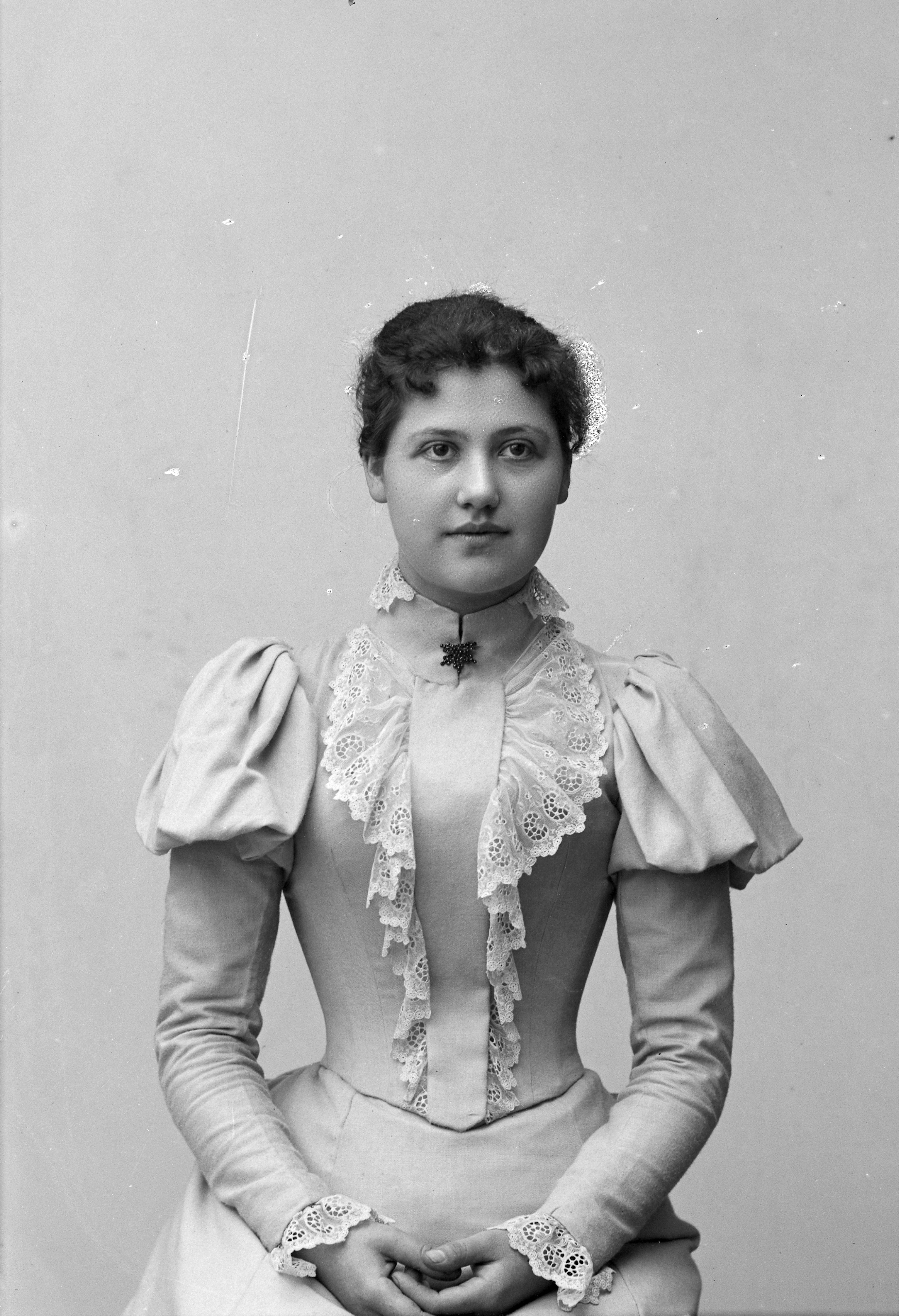 Beskrivning: Porträtt i halvfigur av Nelly Lindeberg.