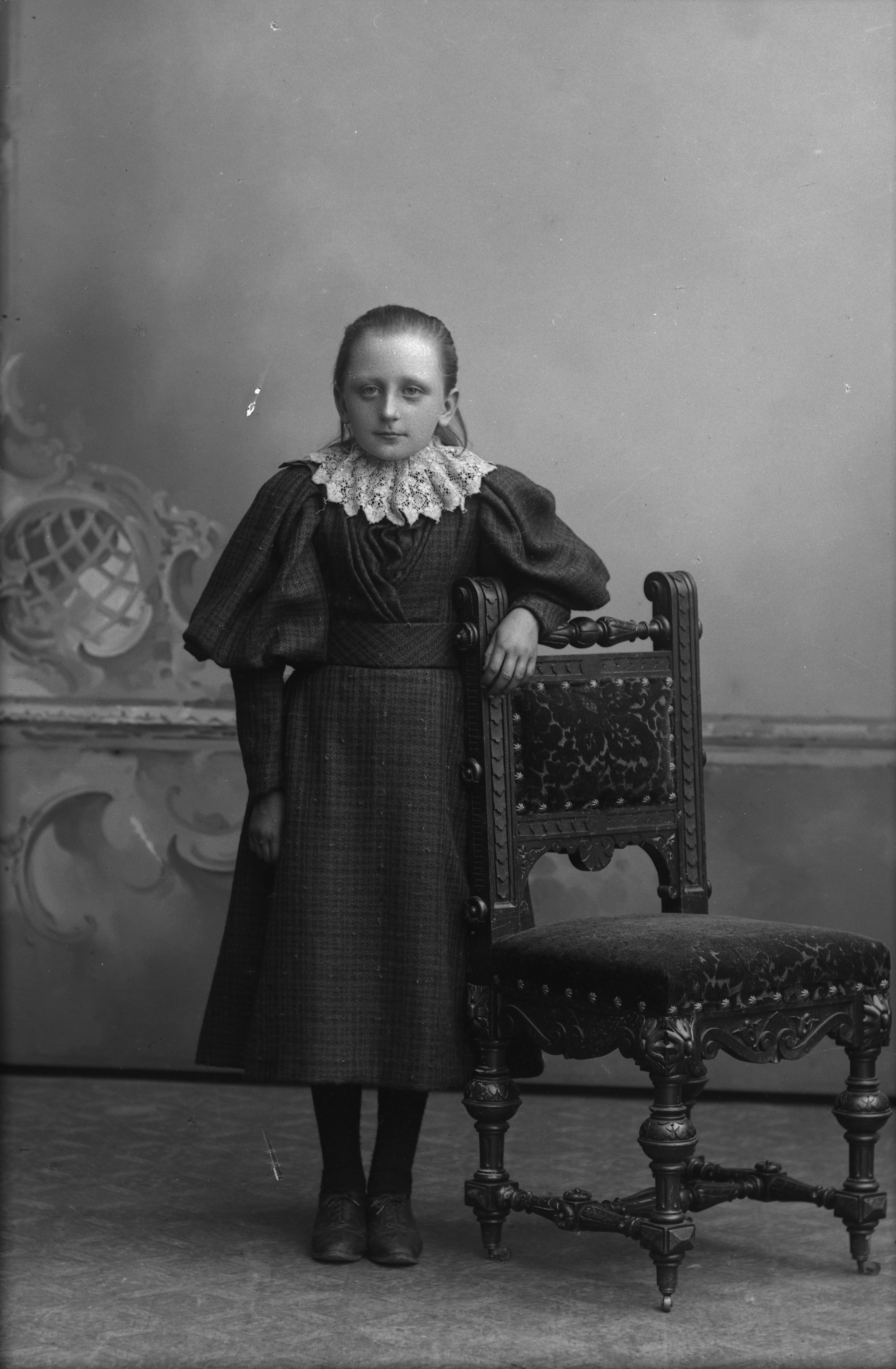 Porträtt i helfigur av Perssons dotter, stående vid stol.