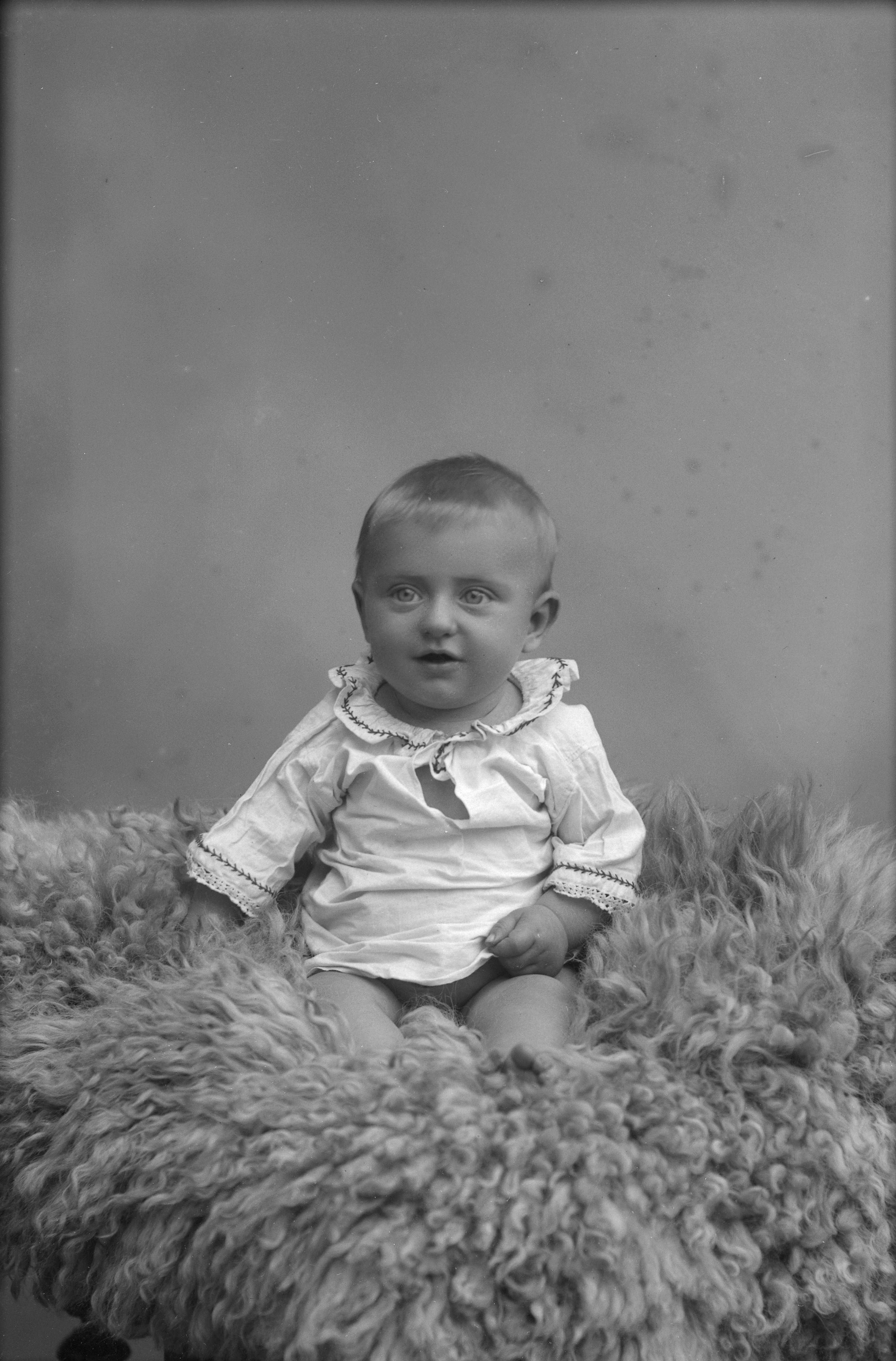 Porträtt i helfigur av Karolina Fors son, sittande på fäll.