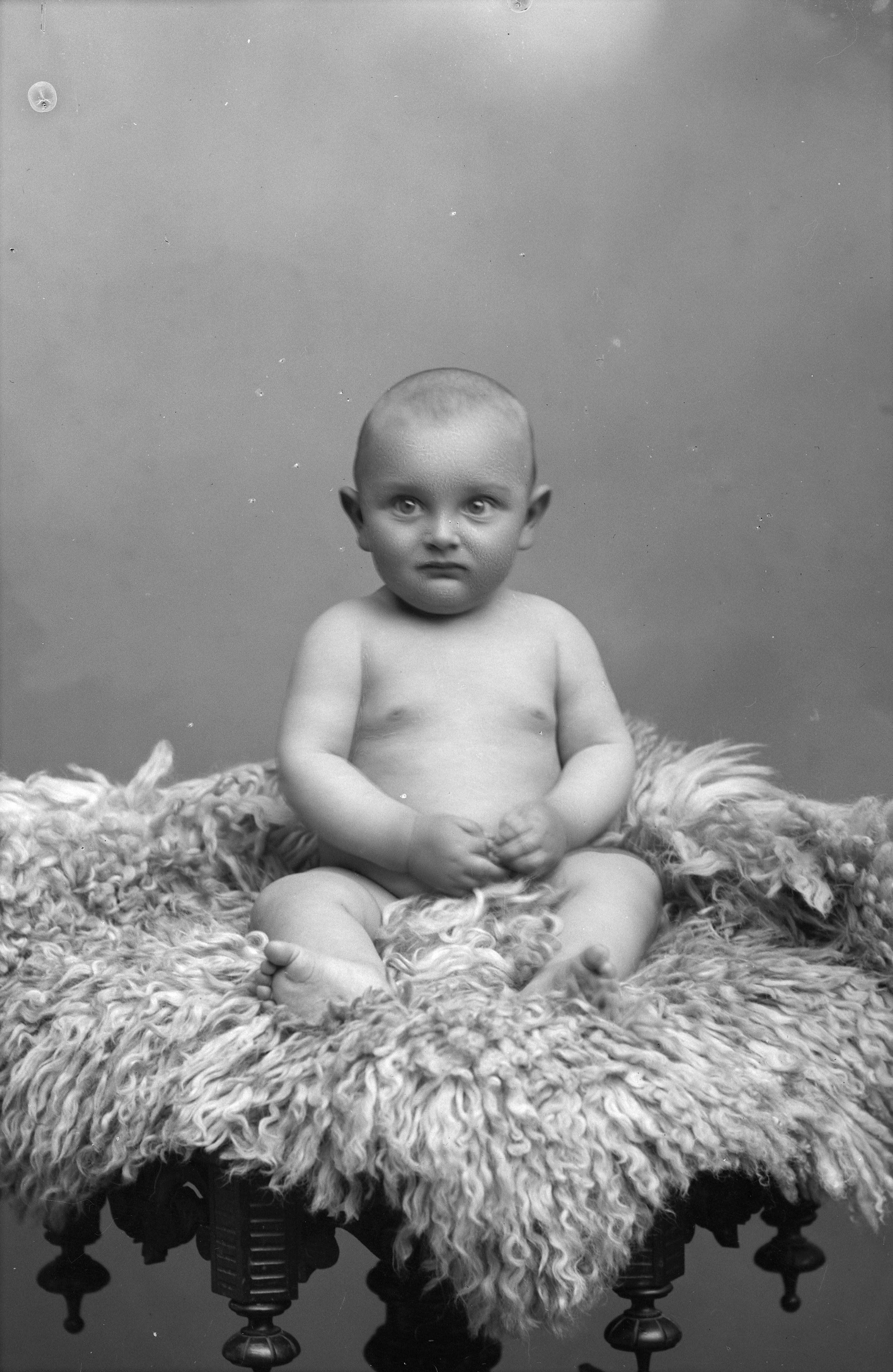 Porträtt i halvfigur av Kronströms son, sittande på fäll.
