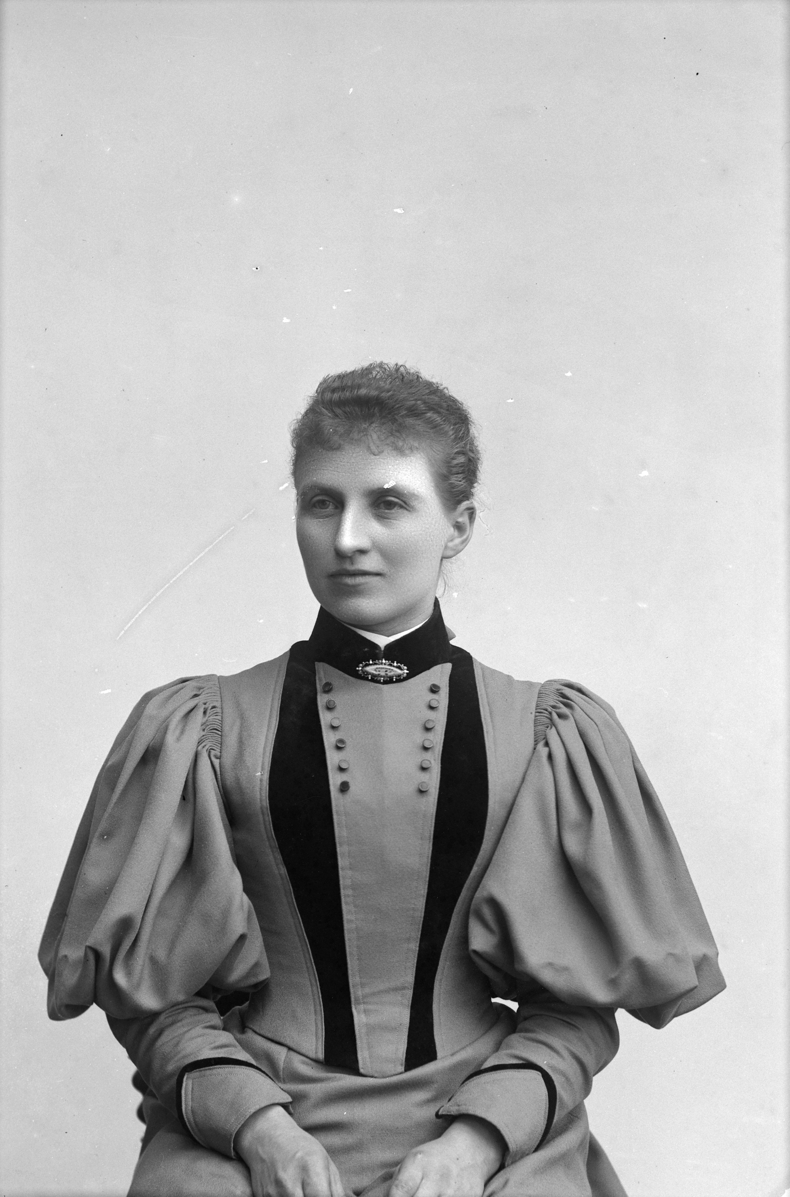 Beskrivning: Porträtt i halvfigur av Ellen Larsson.