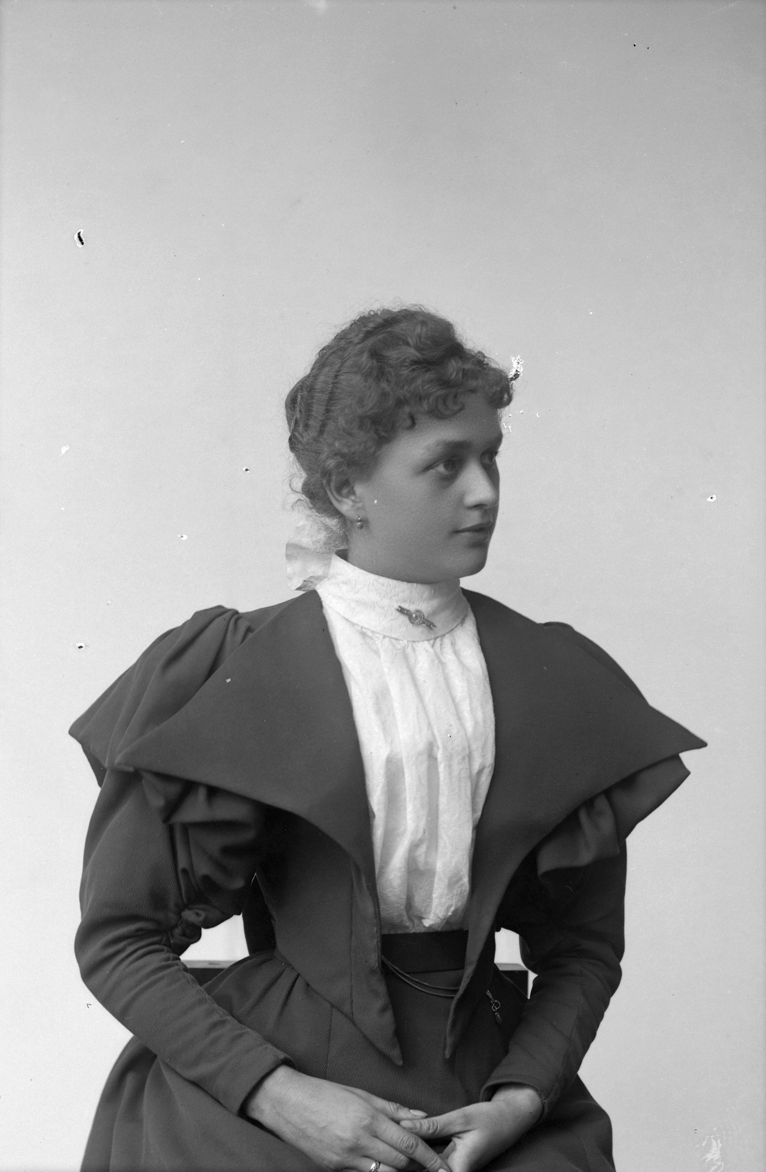 Beskrivning: Porträtt i halvfigur av fröken Bading.