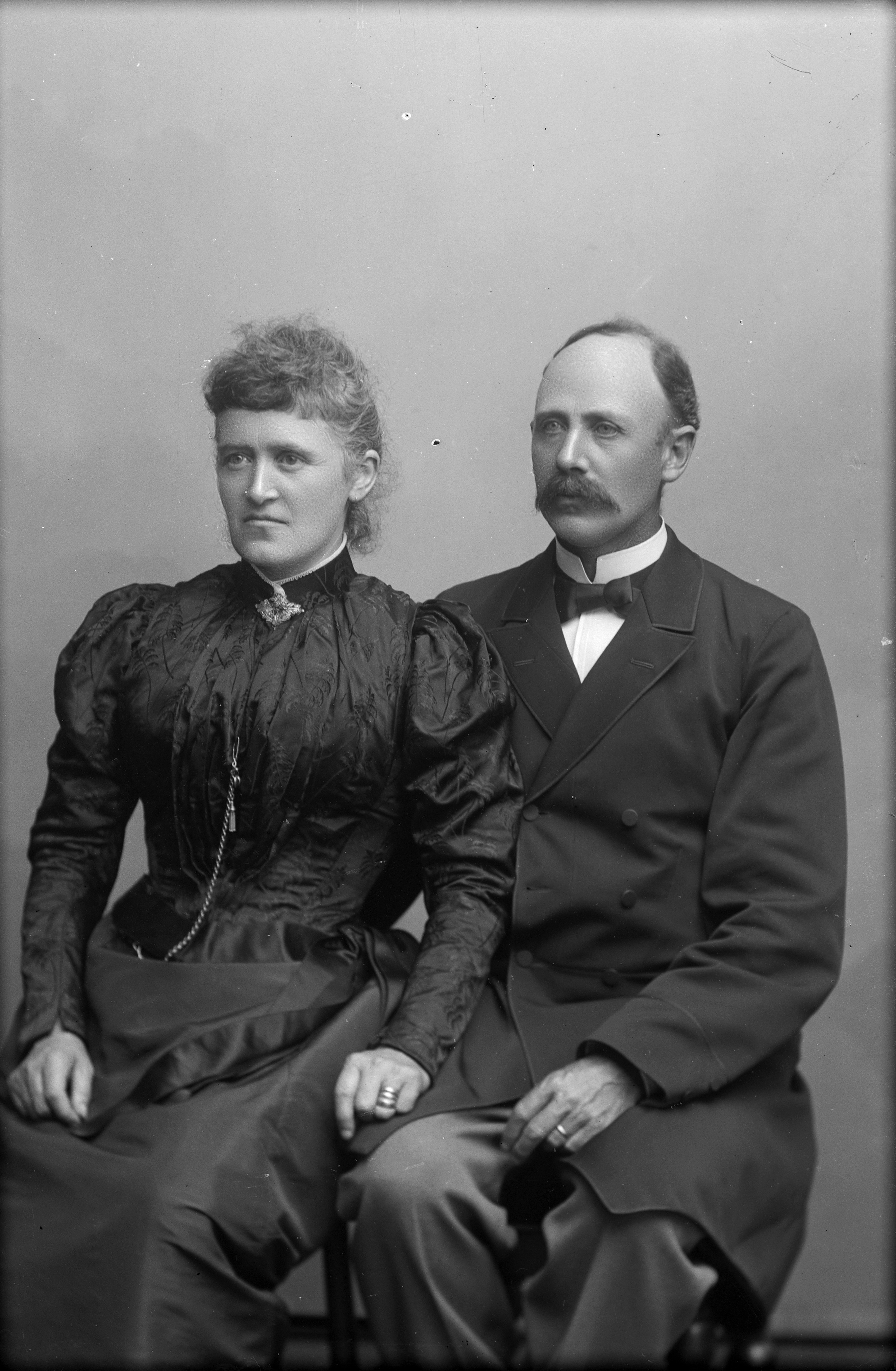Beskrivning: Porträtt i helfigur av herr Guldstrand med fru.