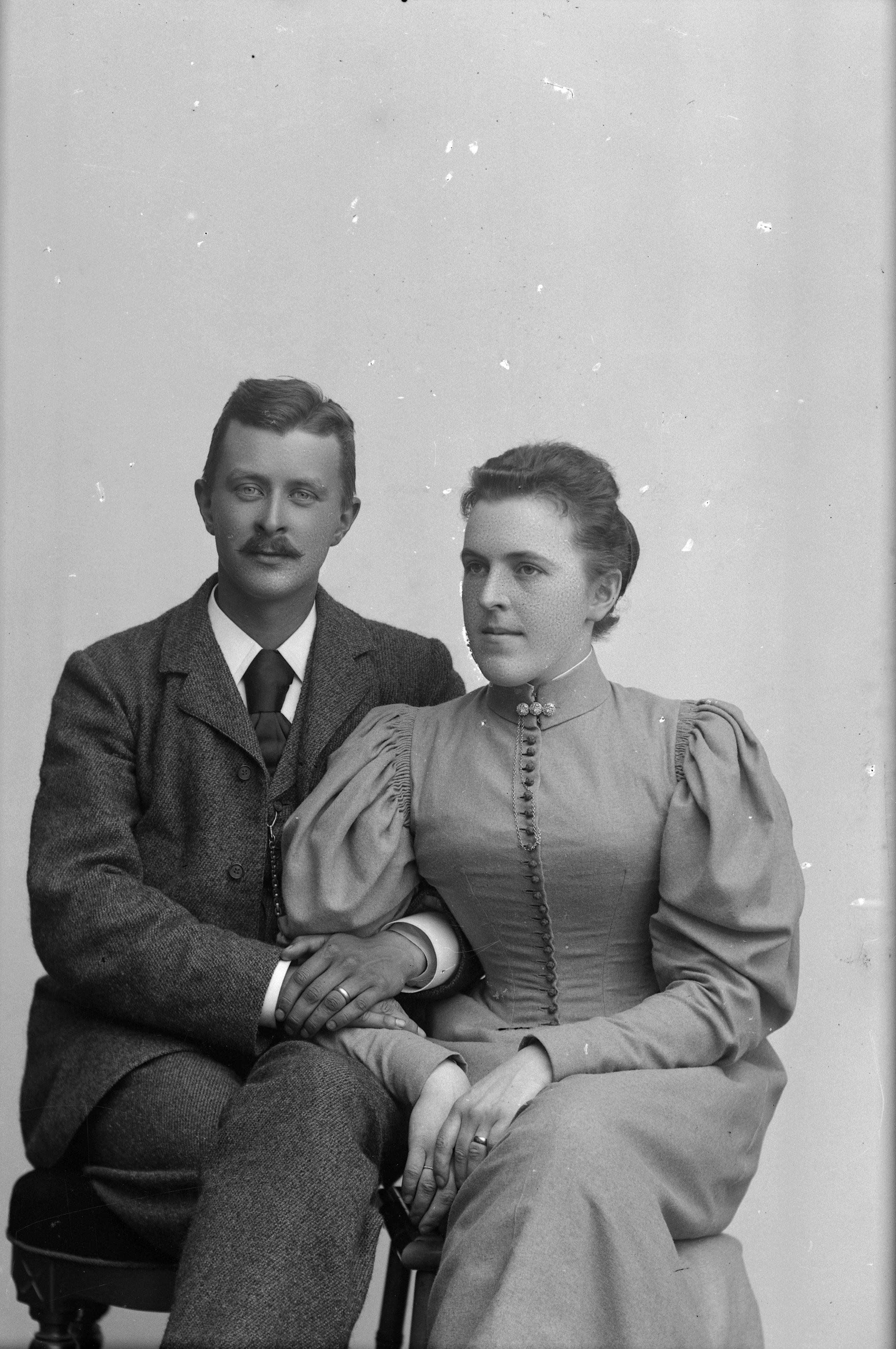 Beskrivning: Porträtt i helfigur av V. Hjort med fru.