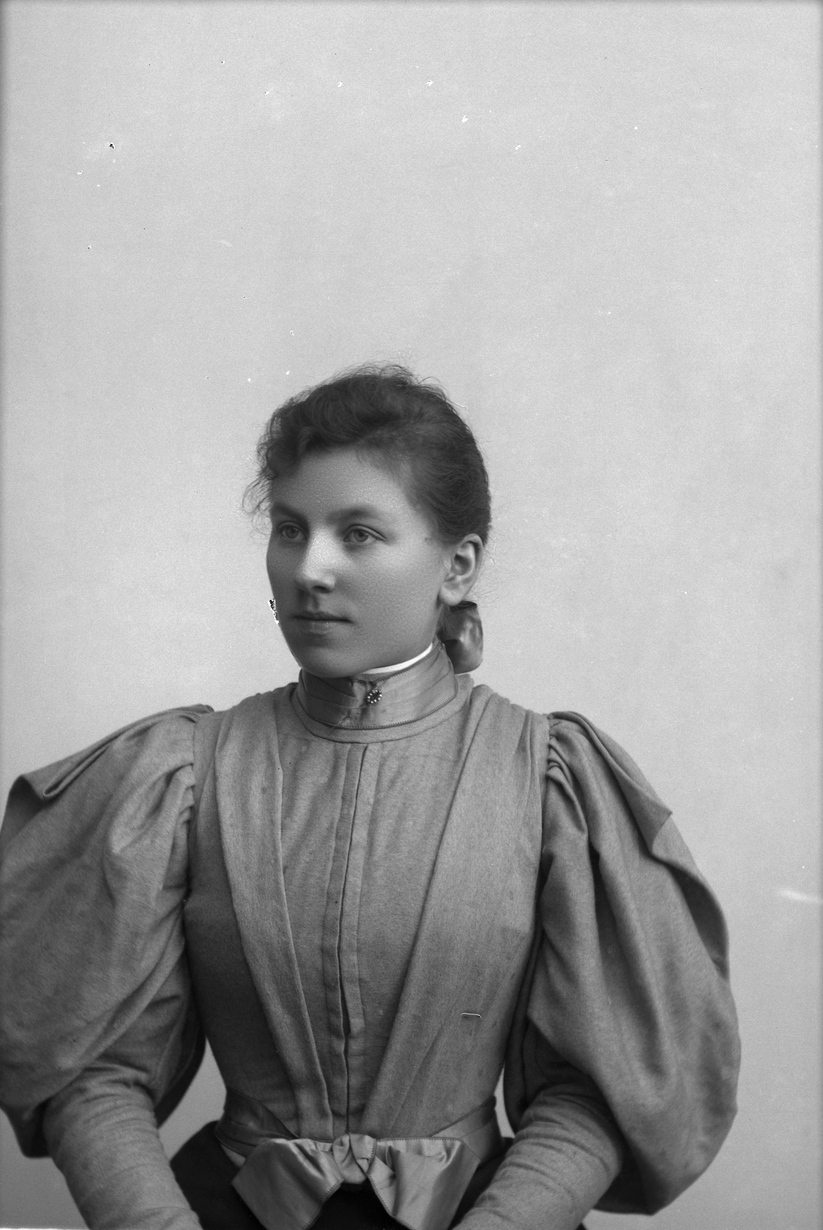 Beskrivning: Porträtt i halvfigur av Gerda Holm.