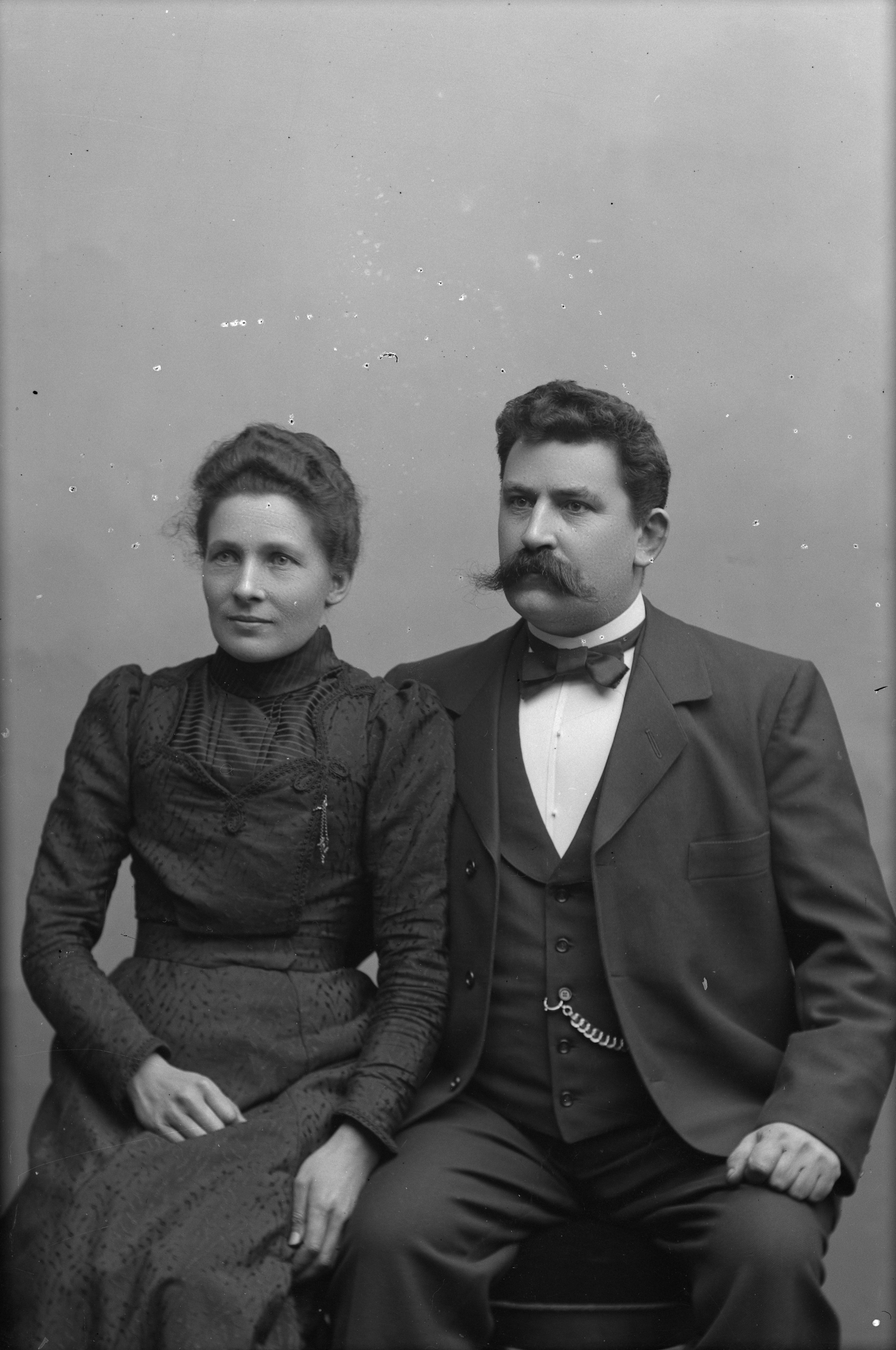 Beskrivning: Porträtt i helfigur av A. Lovén med fru.
