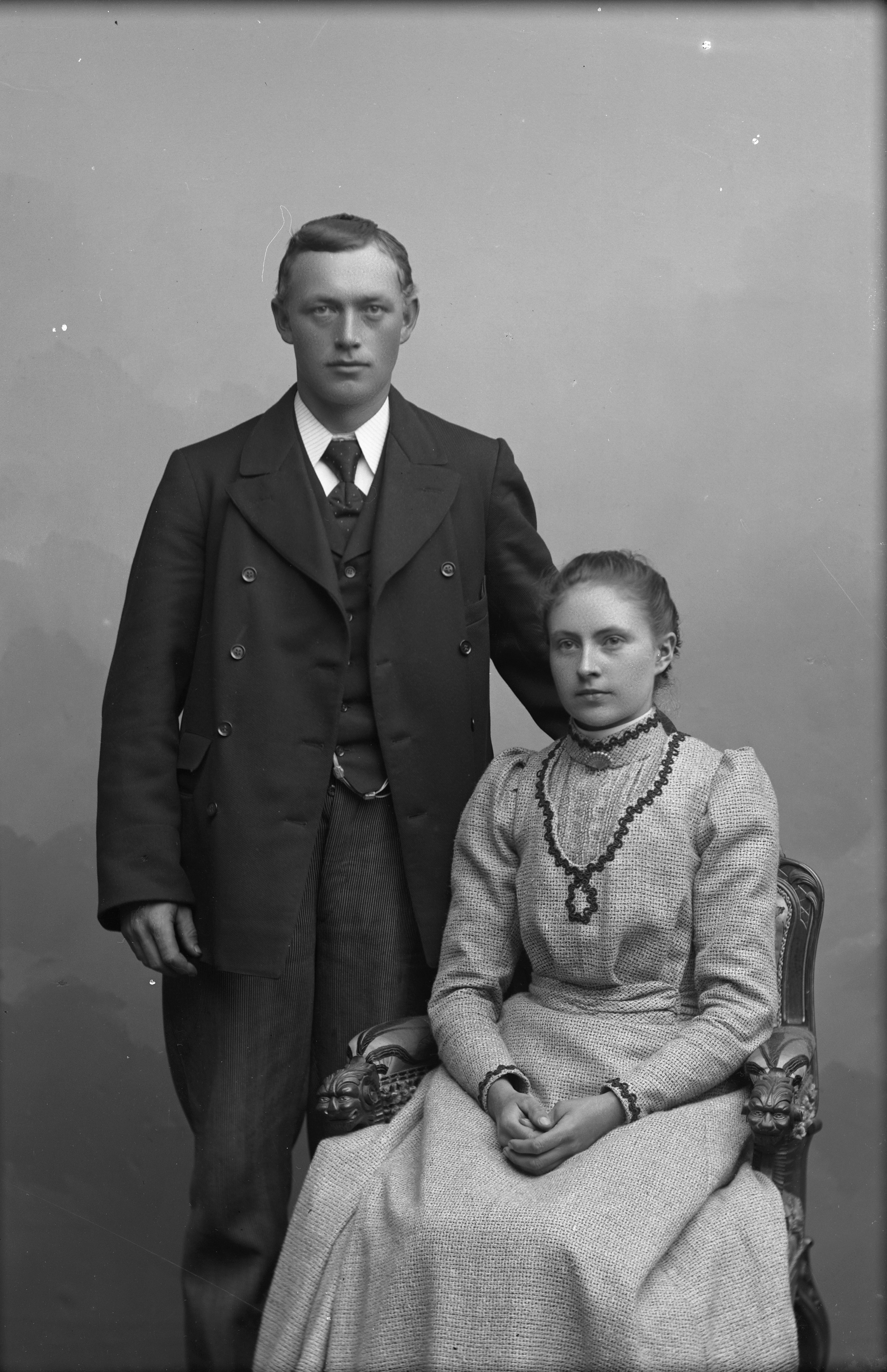 Beskrivning: Porträtt i helfigur av O. Nilsson med fru.