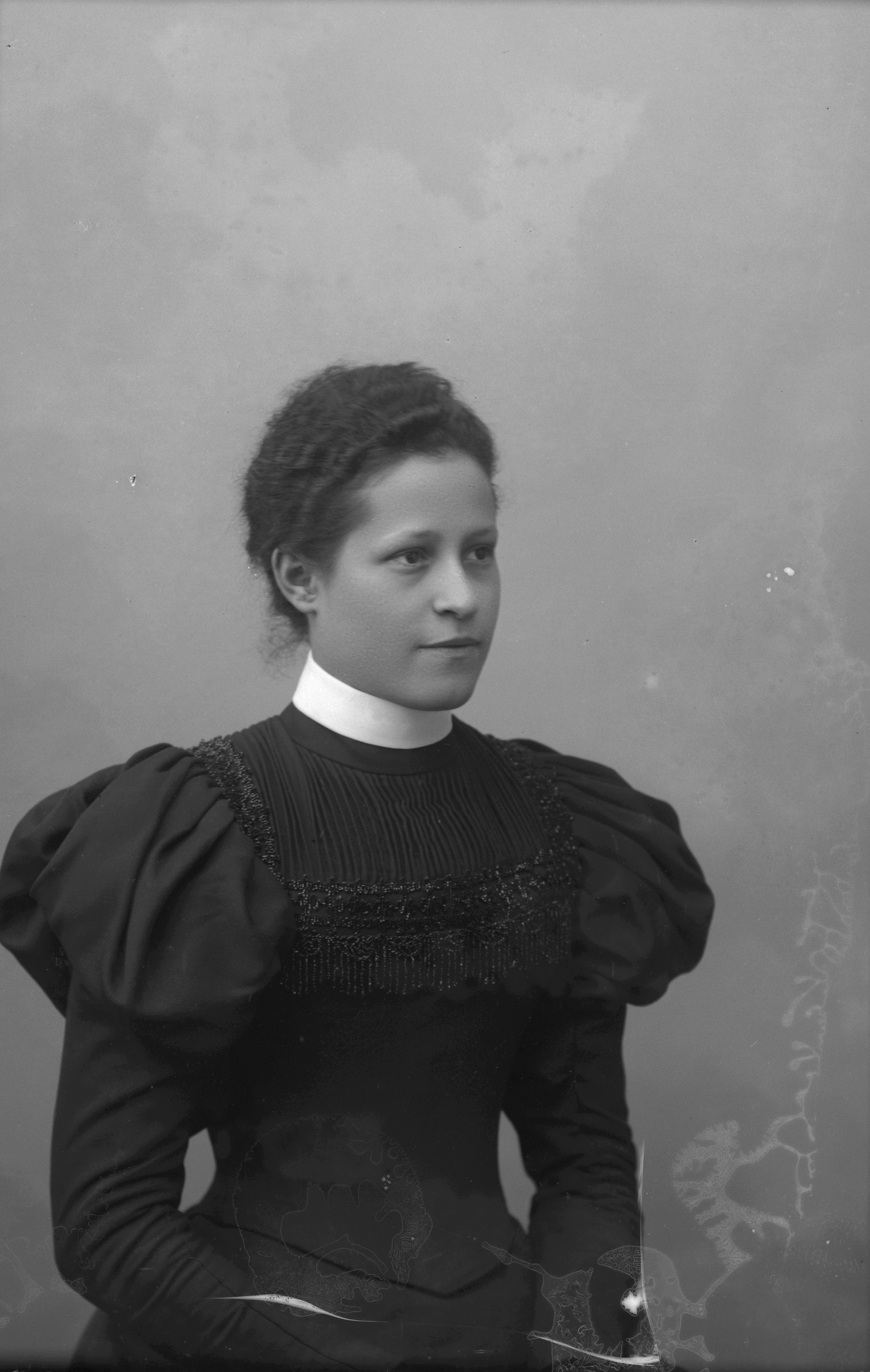 Beskrivning: Porträtt i halvfigur av fröken Forsberg.