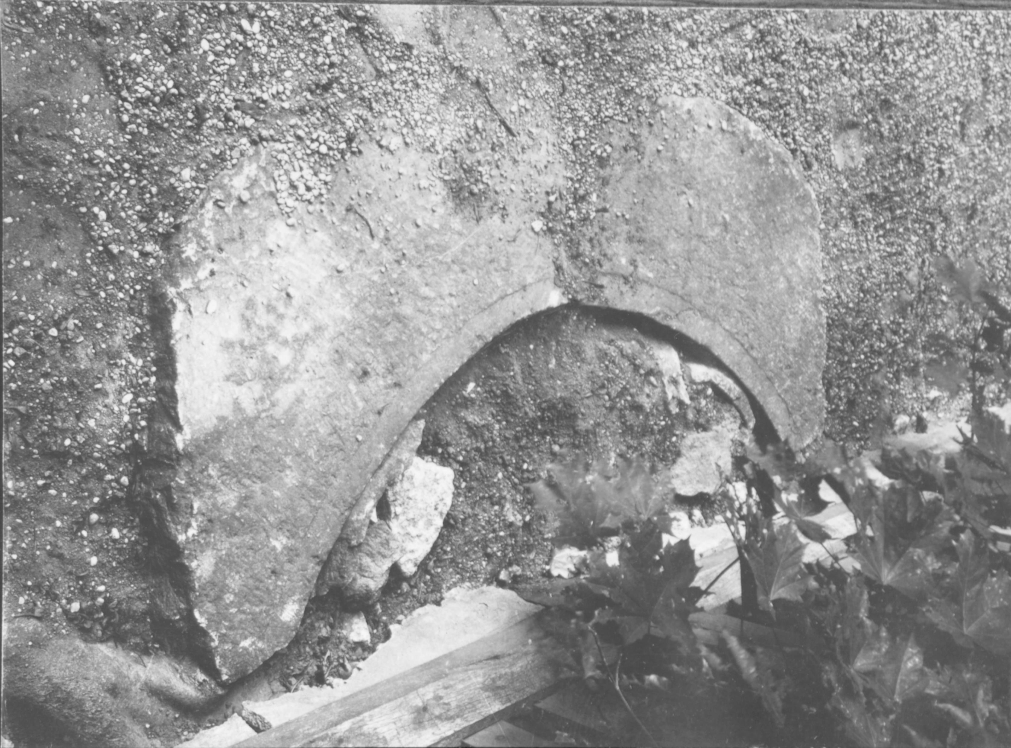 Överstycke till fönster liggande i marken på prästgårdens gräsplan.