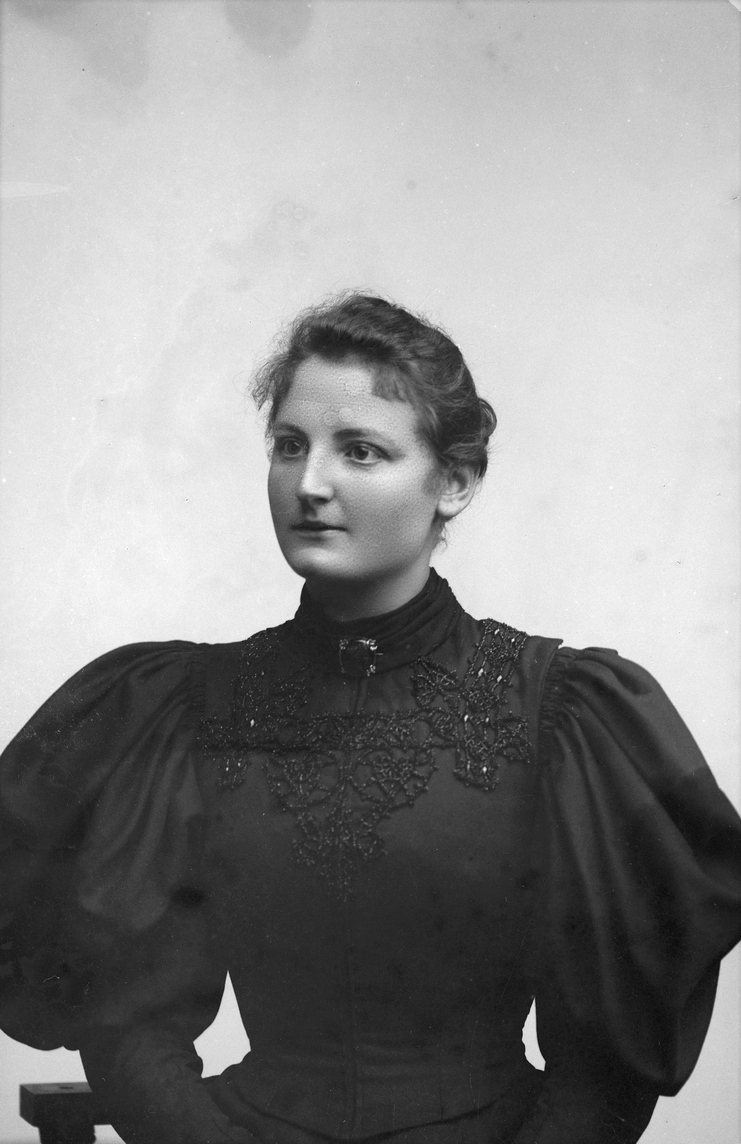 Beskrivning: Porträtt i halvfigur av Gerda Månsson.