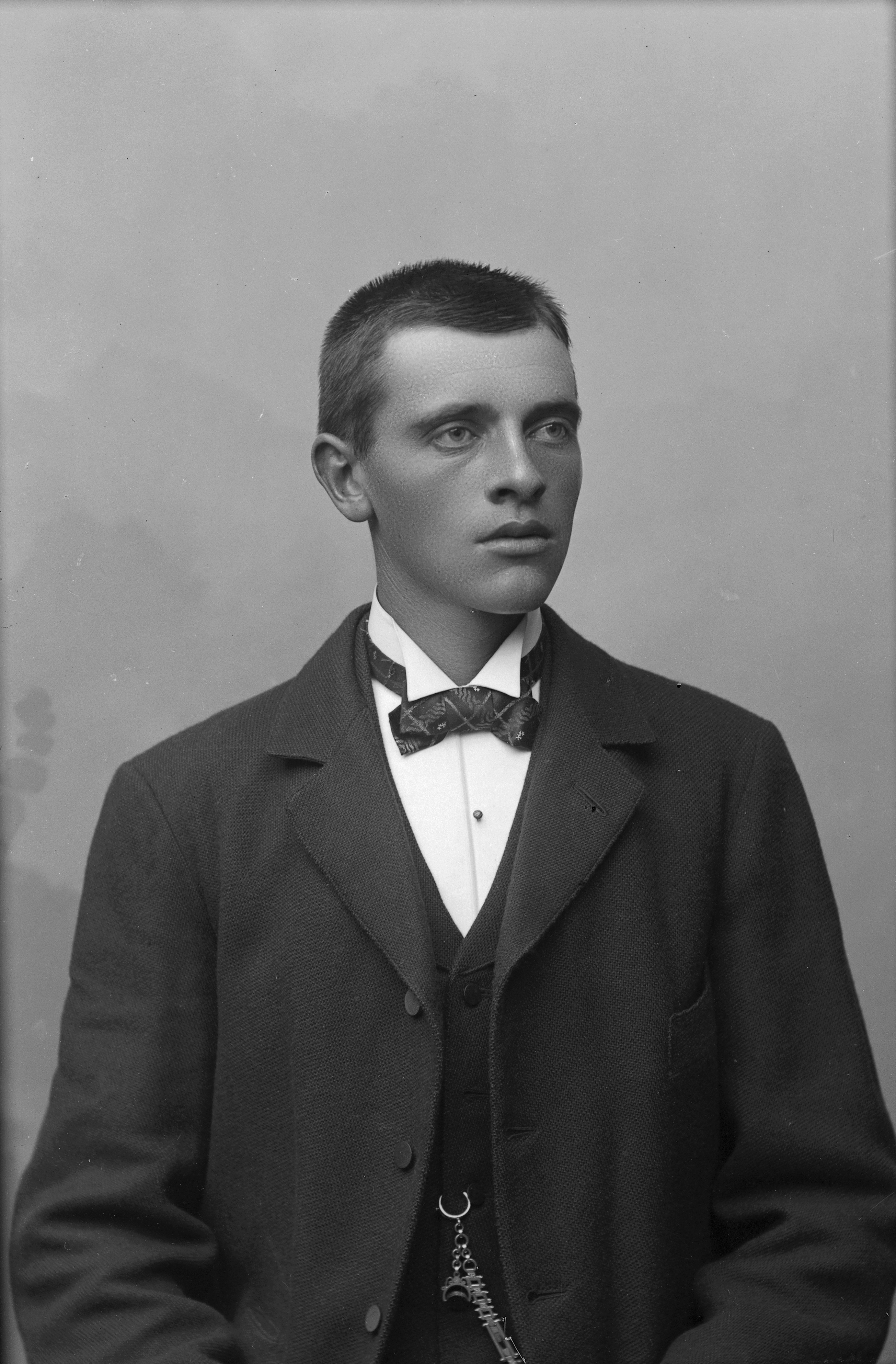 Beskrivning: Porträtt i halvfigur av P. Skog.