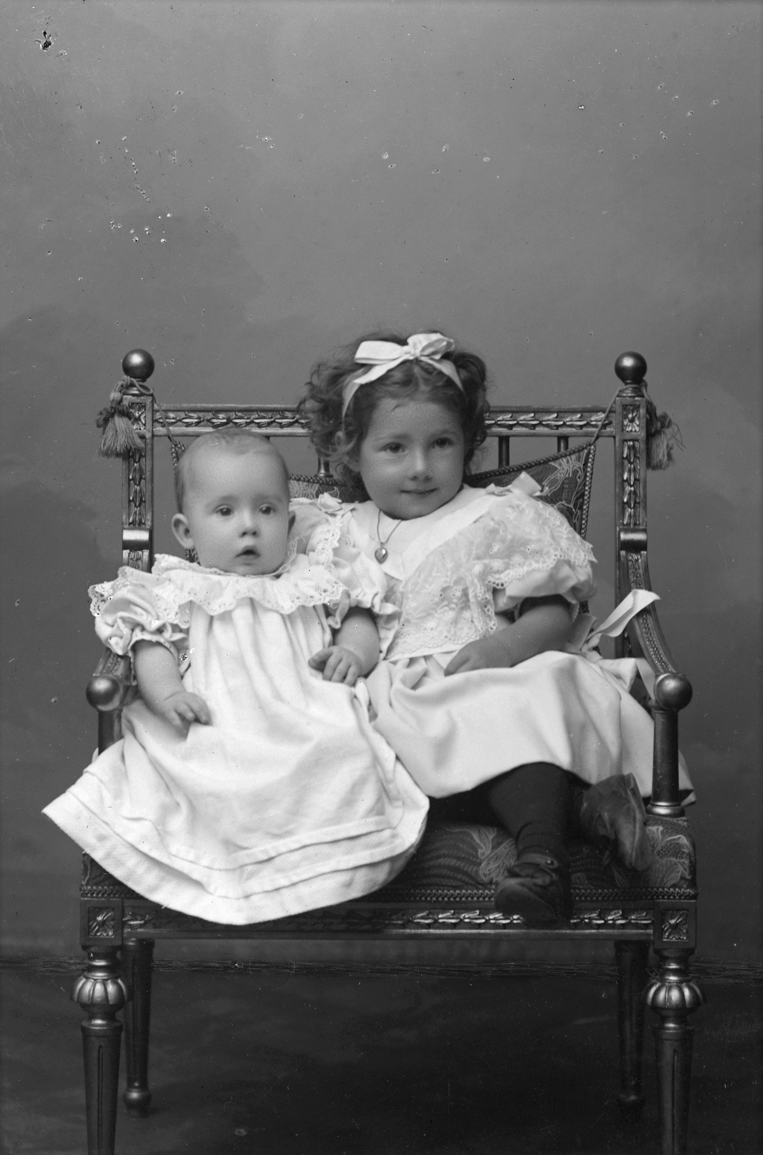 Beskrivning: Porträtt i helfigur av Hulténs son och dotter, sittande i stol. Dottern med rosett i håret.