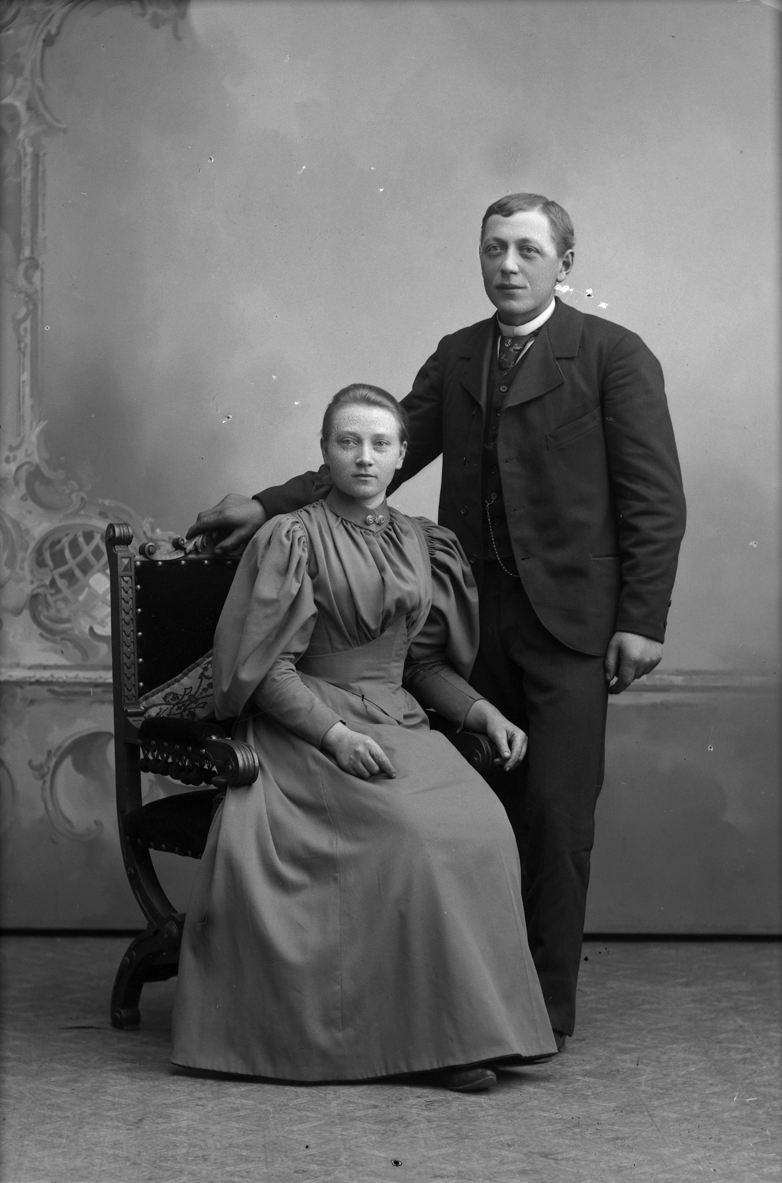 Beskrivning: Porträtt i helfigur av mejerist Dagmar Christensen med fru (?).