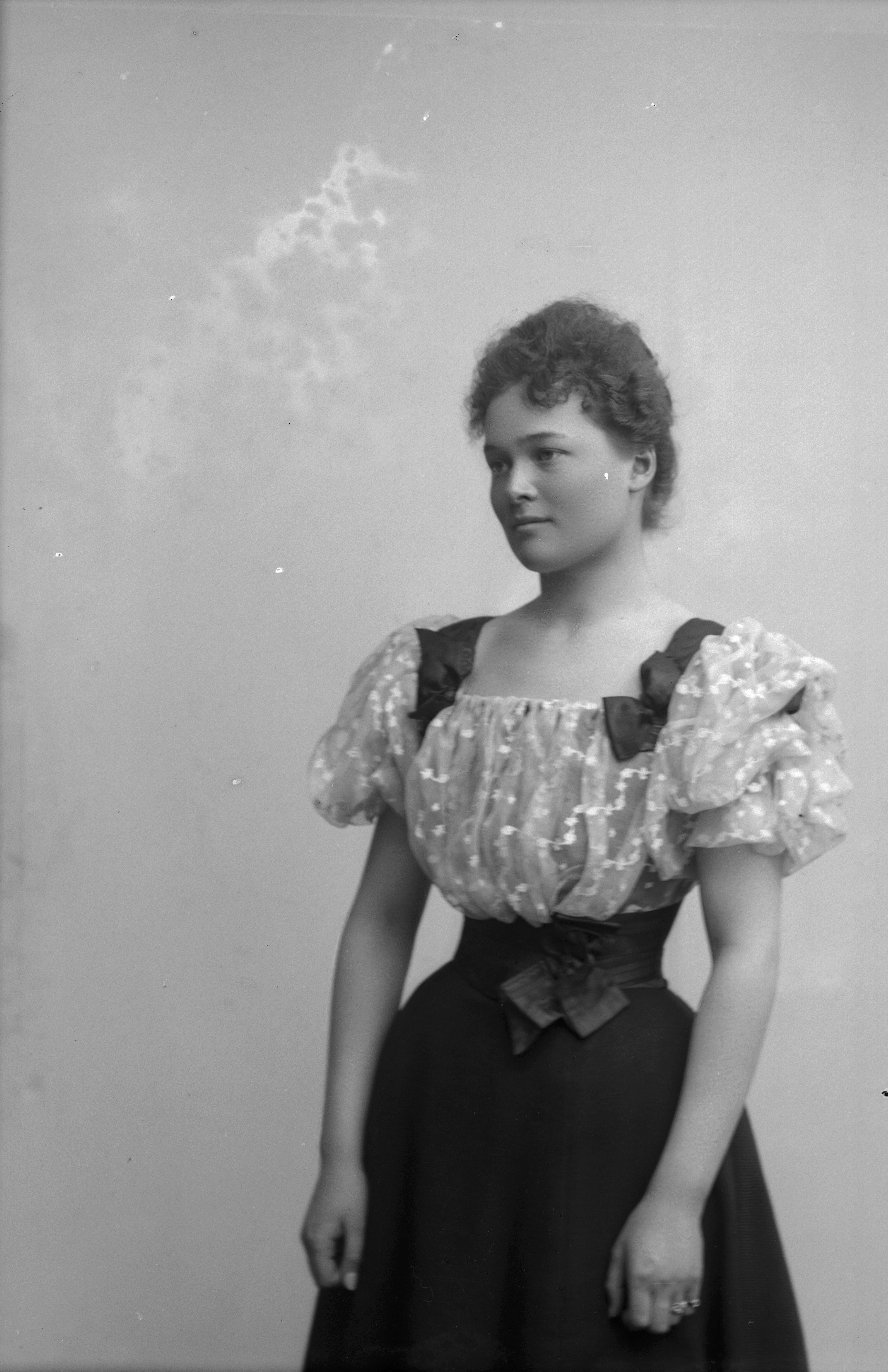 Beskrivning: Porträtt i helfigur av fröken Berg von Linde.