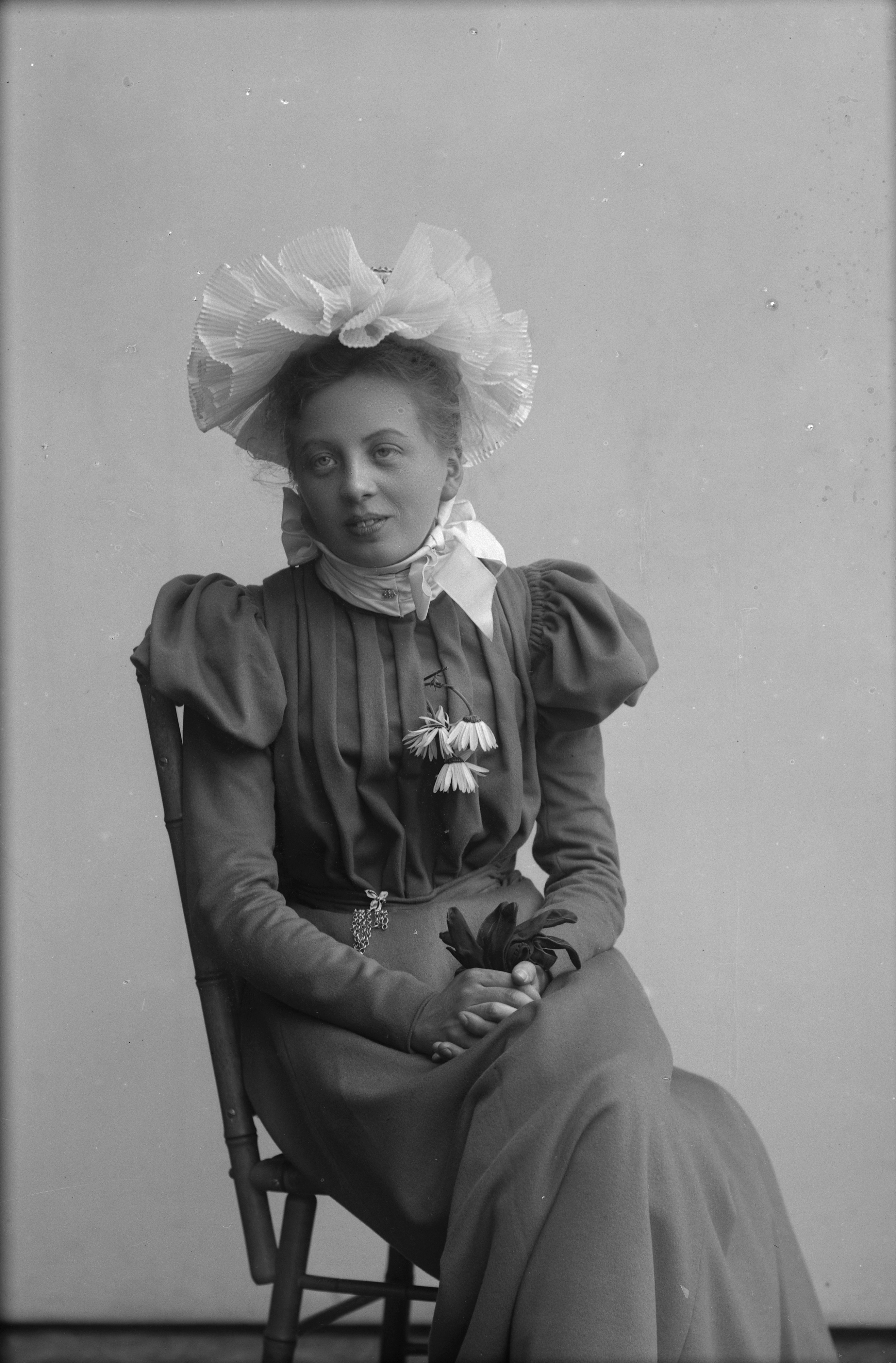 Porträtt i helfigur av fröken Holmström, student på Hvilan, sittande i stol.