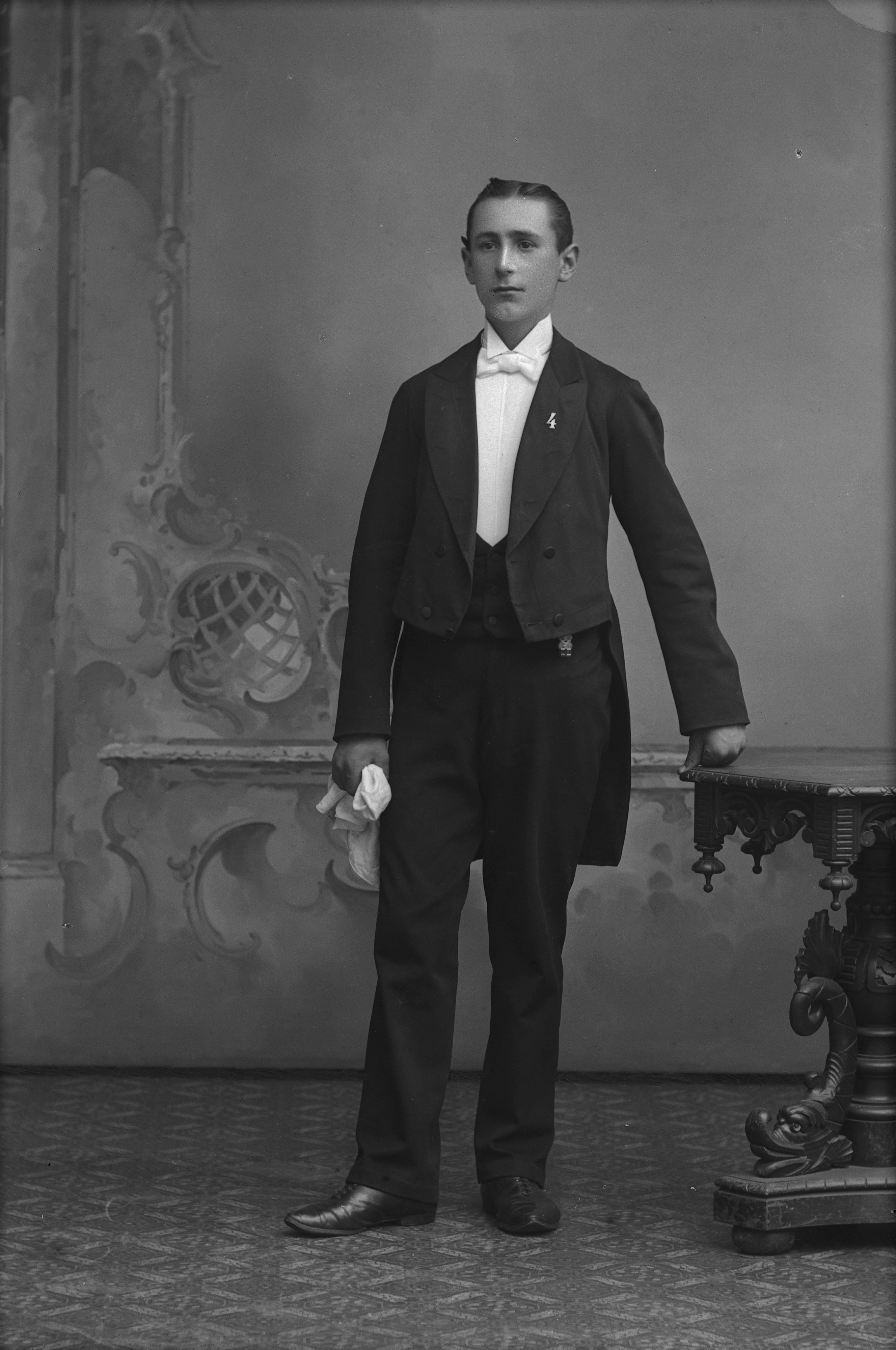 Porträtt i helfigur av herr Värnblad, stående vid skulpterat pelarbord (i nyrenässans).
