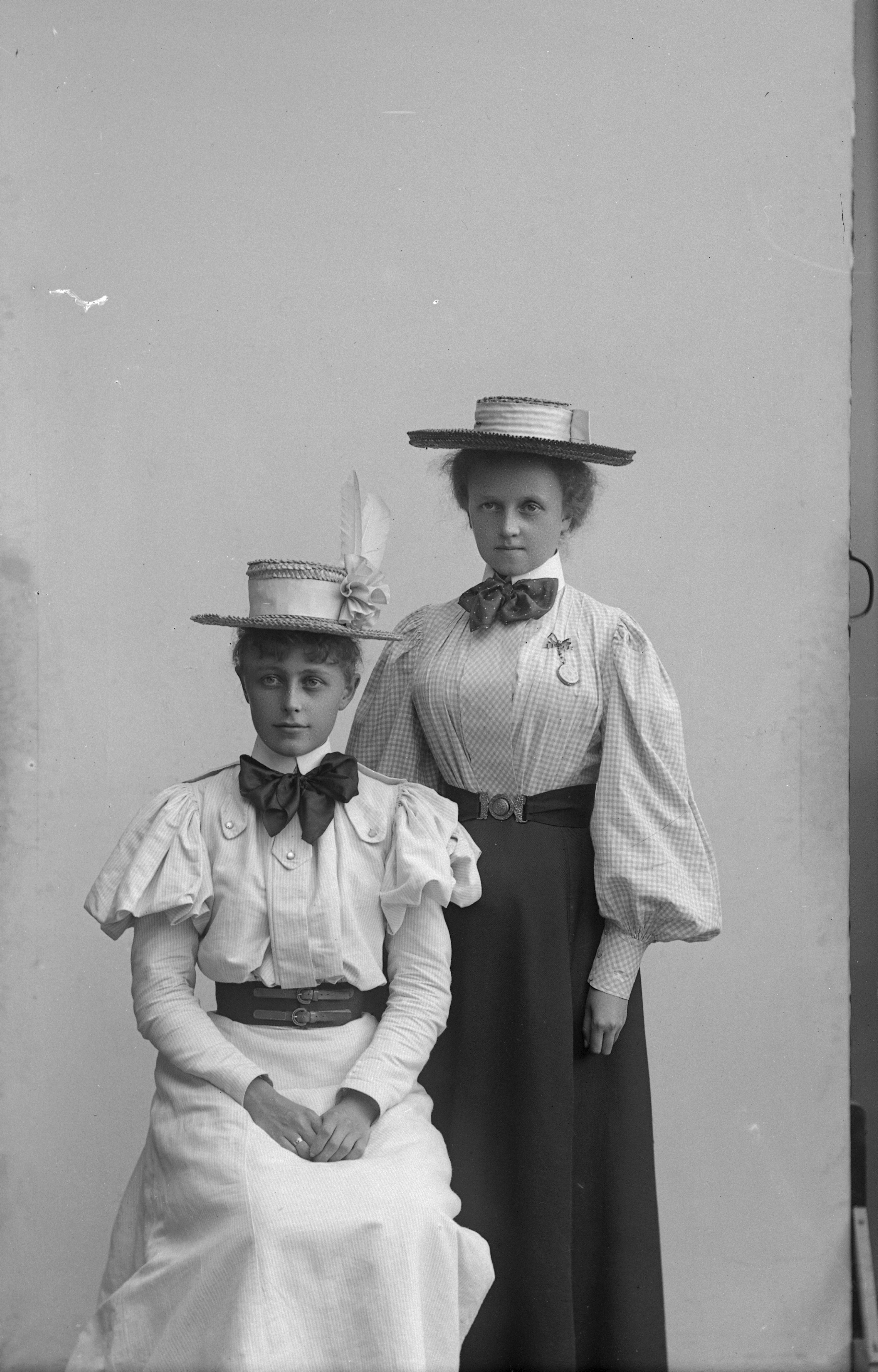 Porträtt i helfigur av fröken Olsson med okänd kvinna, iklädda hattar.