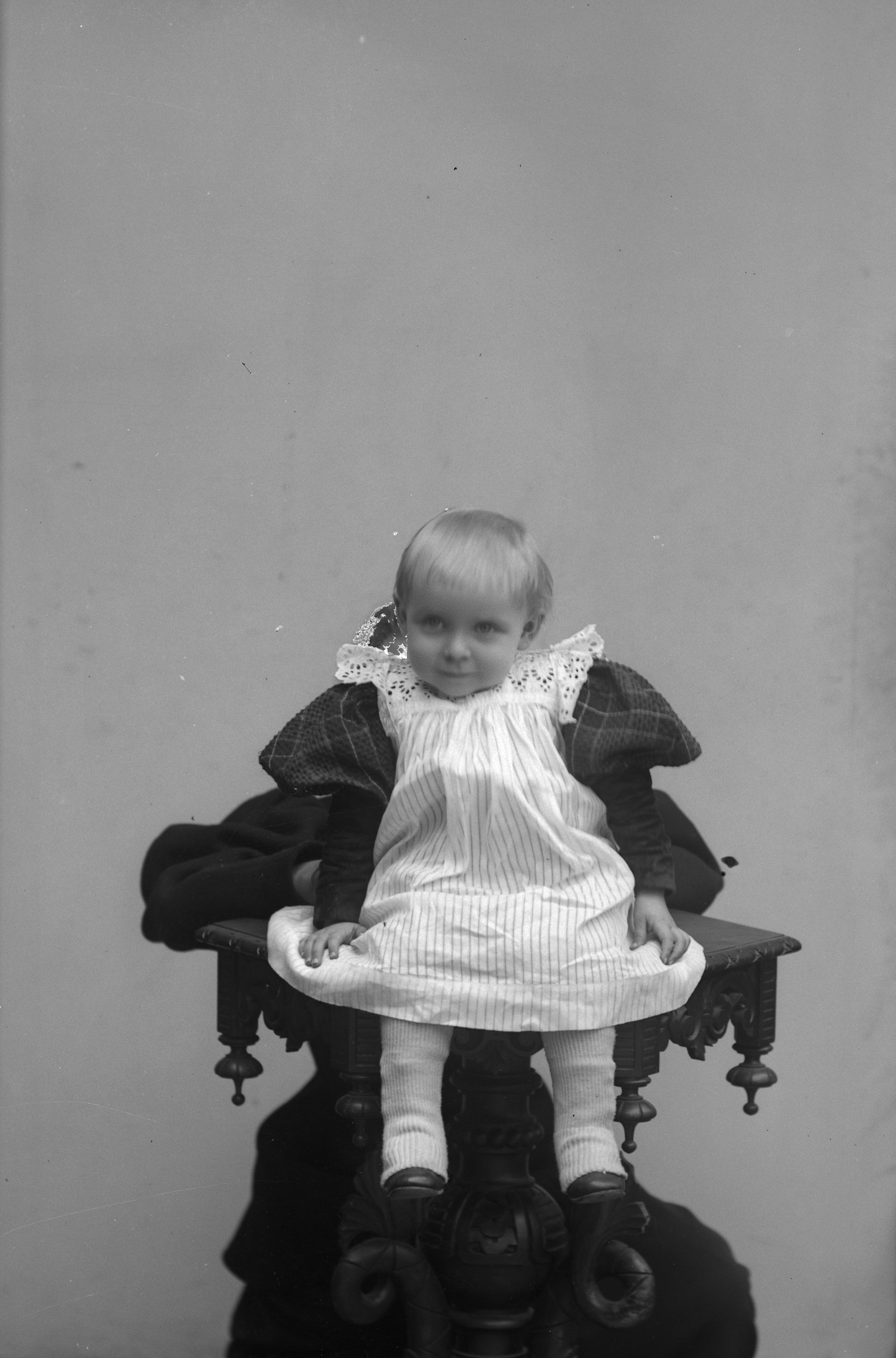 Porträtt i halvfigur av Kartmans dotter, sittande på bord.