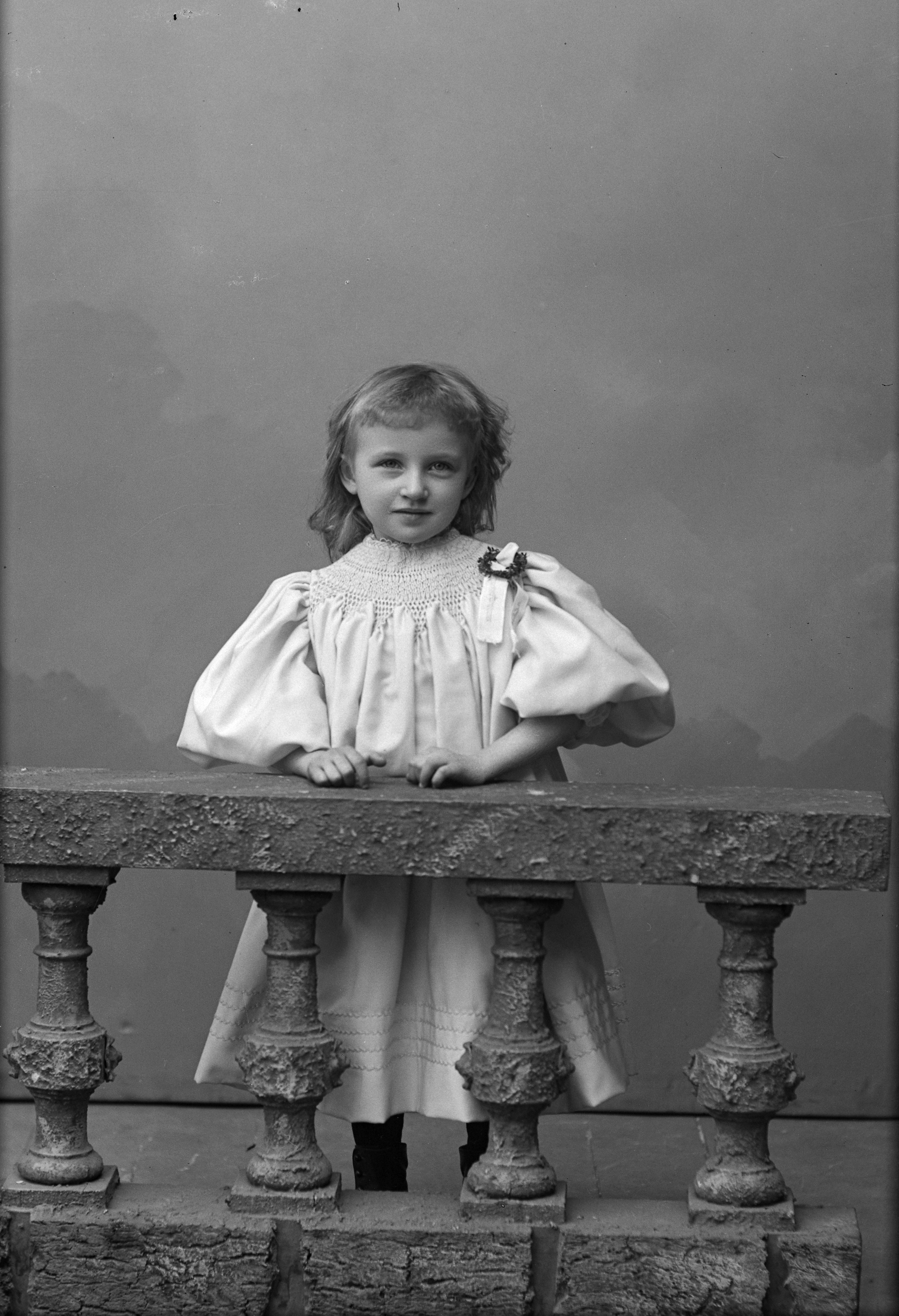Porträtt i helfigur av Gunhild Asp, stående bakom stenstaket med balustrad.