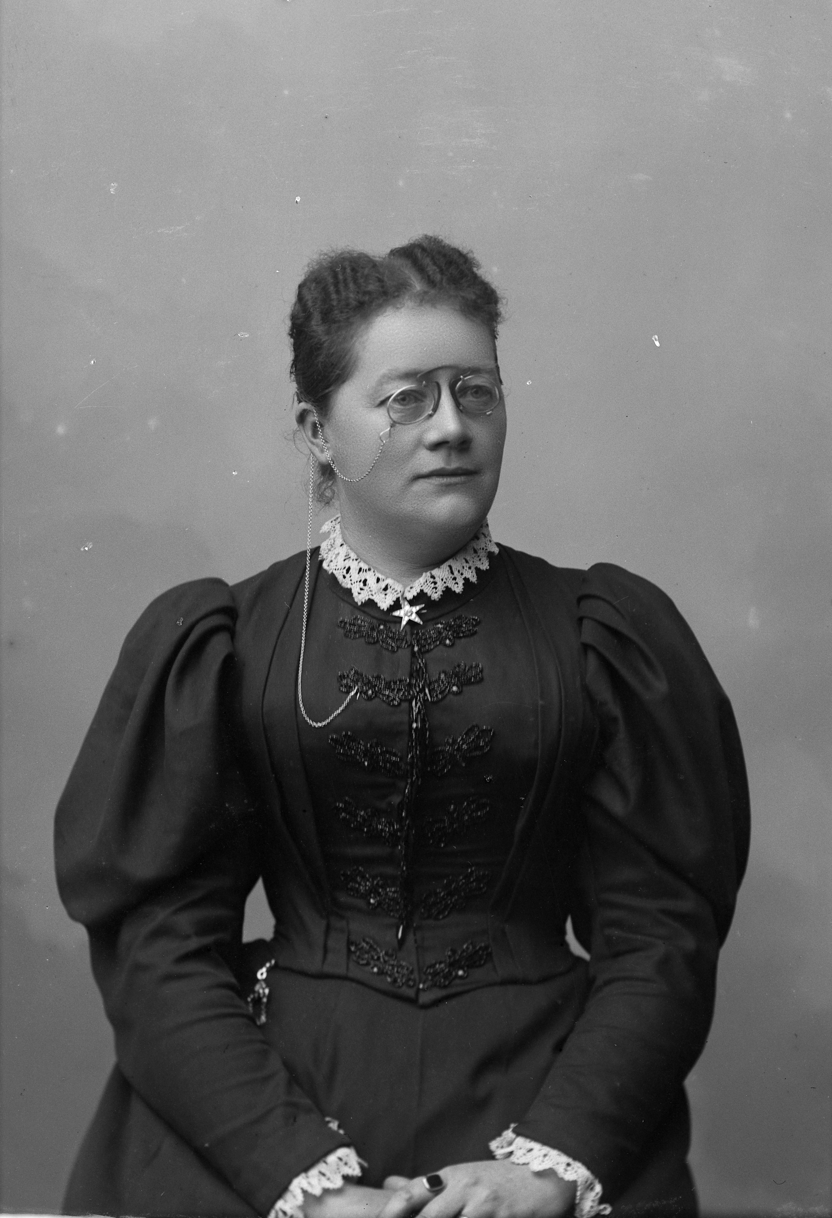 Beskrivning: Porträtt i halvfigur av fru Holst /Höör.
