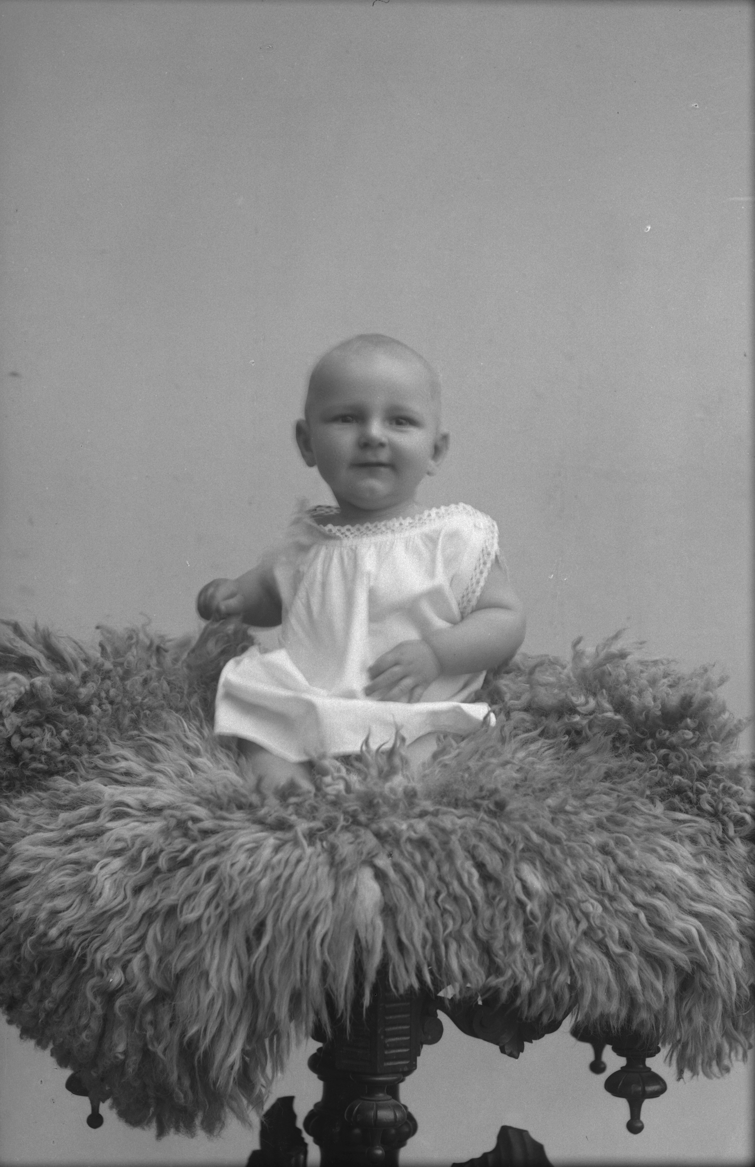Porträtt i helfigur av Hanna Nilssons son, sittande på fäll.