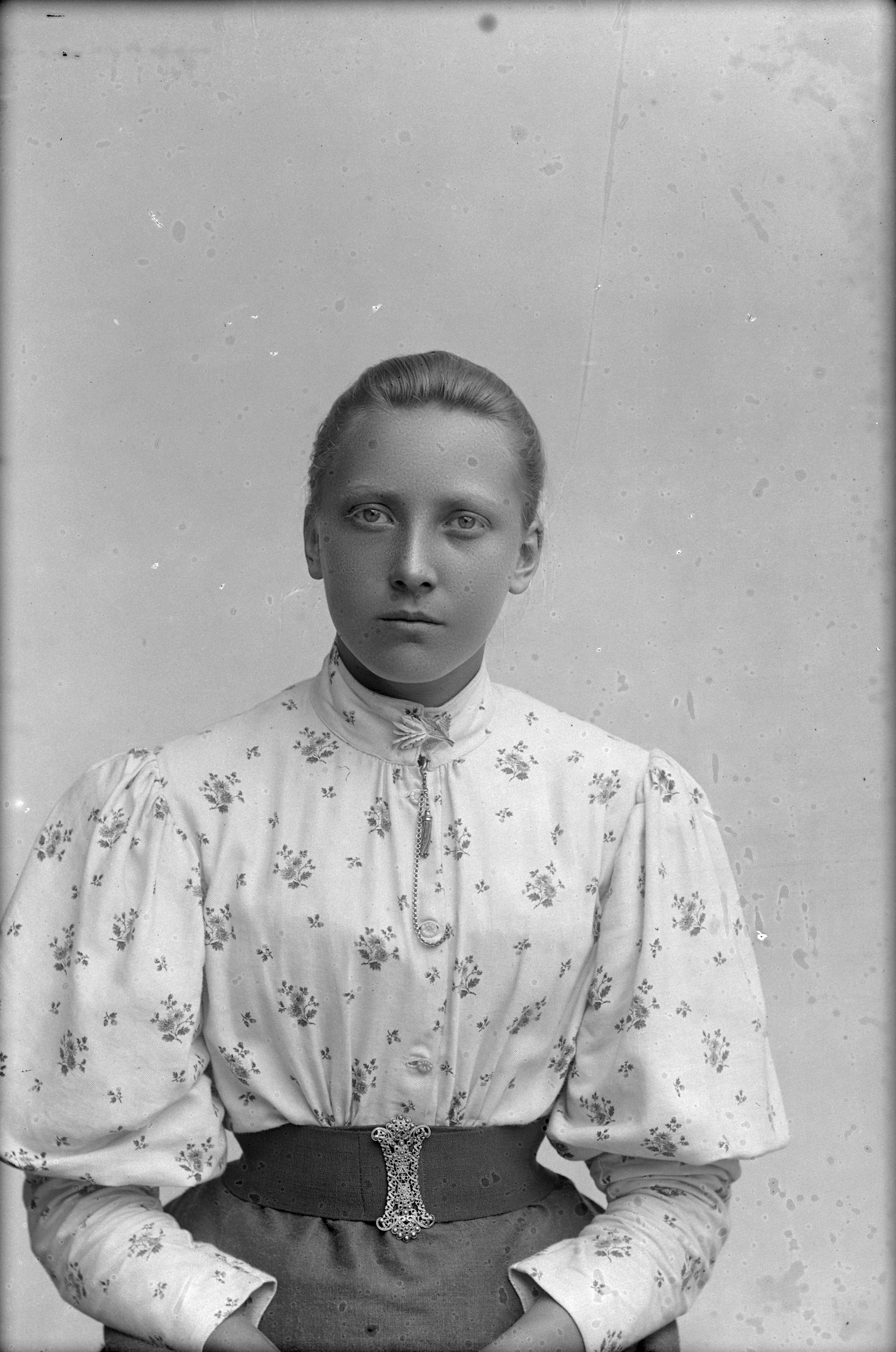Beskrivning: Porträtt i halvfigur av Anna Arvidsson vid Hököpinge Sockerbruk.