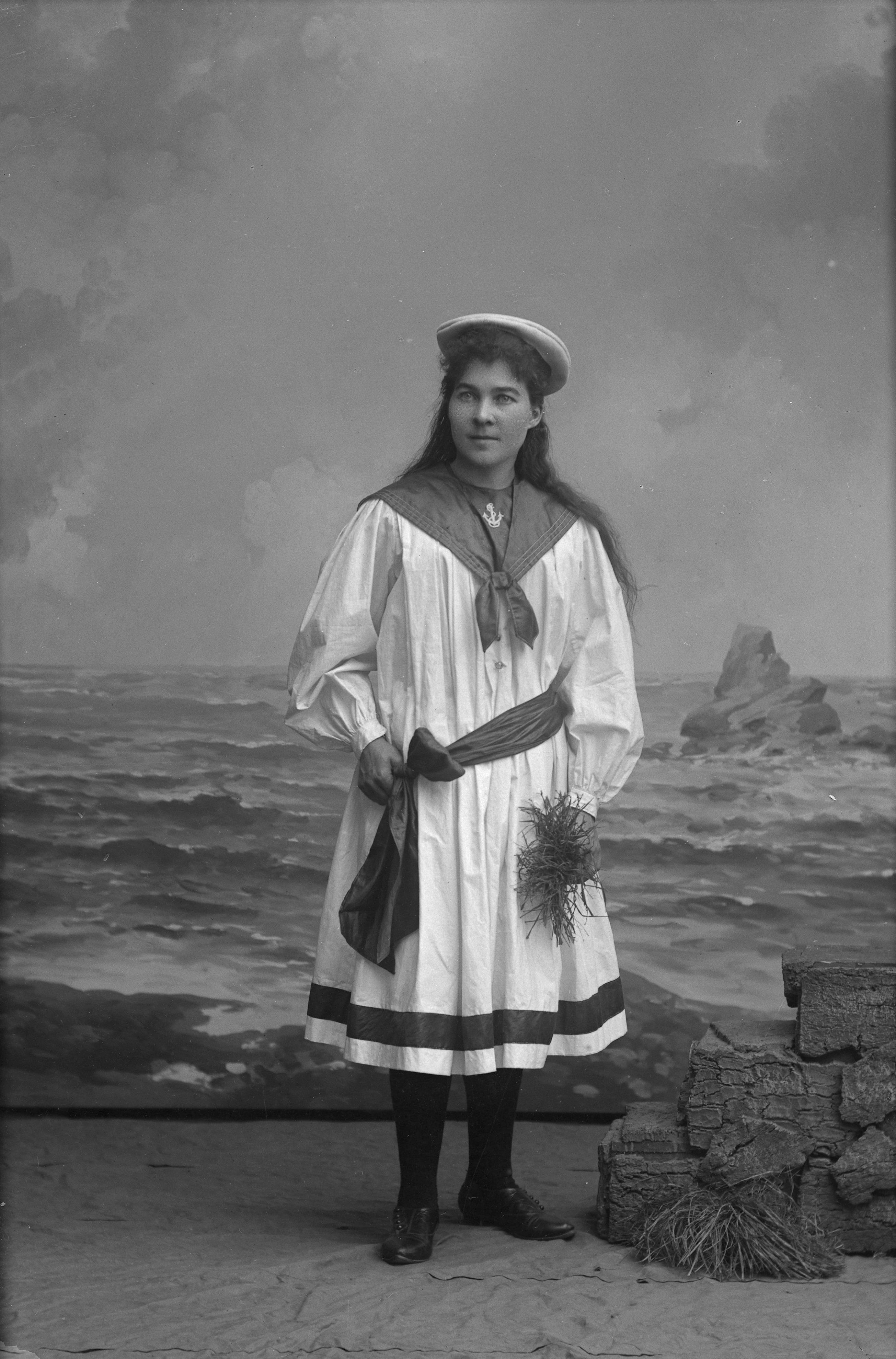 Porträtt i helfigur av Elin Nilsson, iklädd sjömanskostym och -mössa, stående vid stenmur, hållande kvistar i handen. Fotograferad framför ateljéfond med havsmotiv.