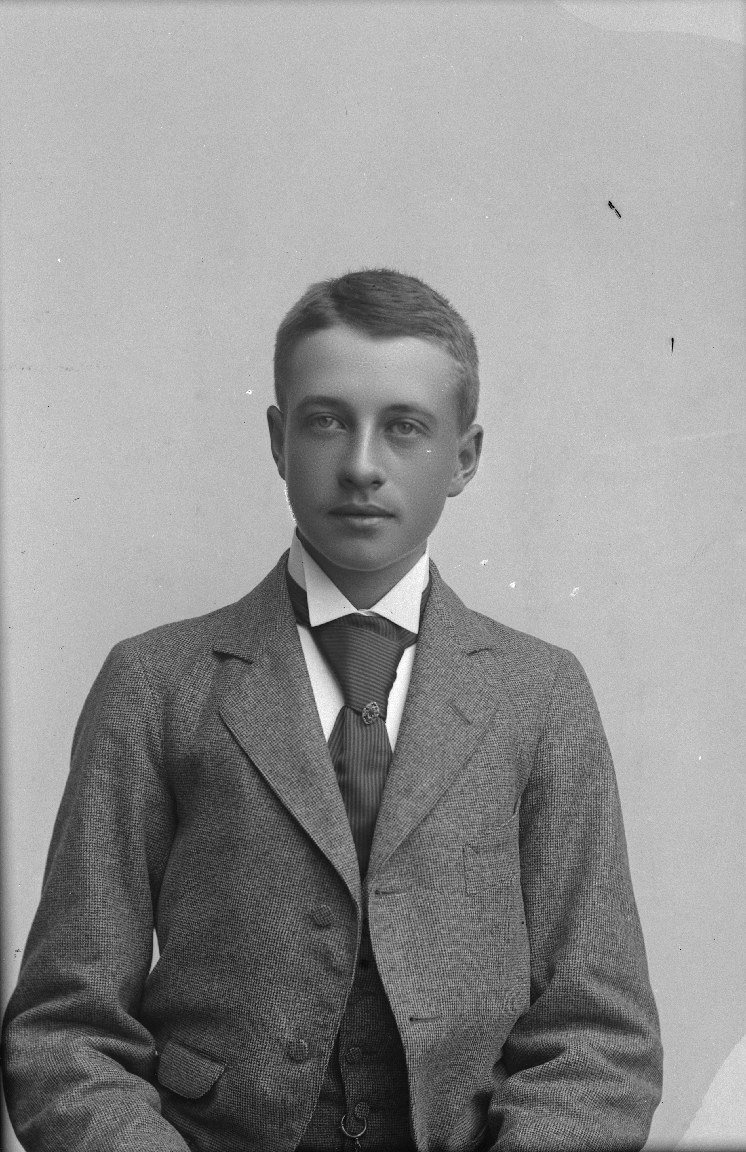 Beskrivning: Porträtt i halvfigur av studerande Bror August Holmgren. Blev sedermera postexpeditör.