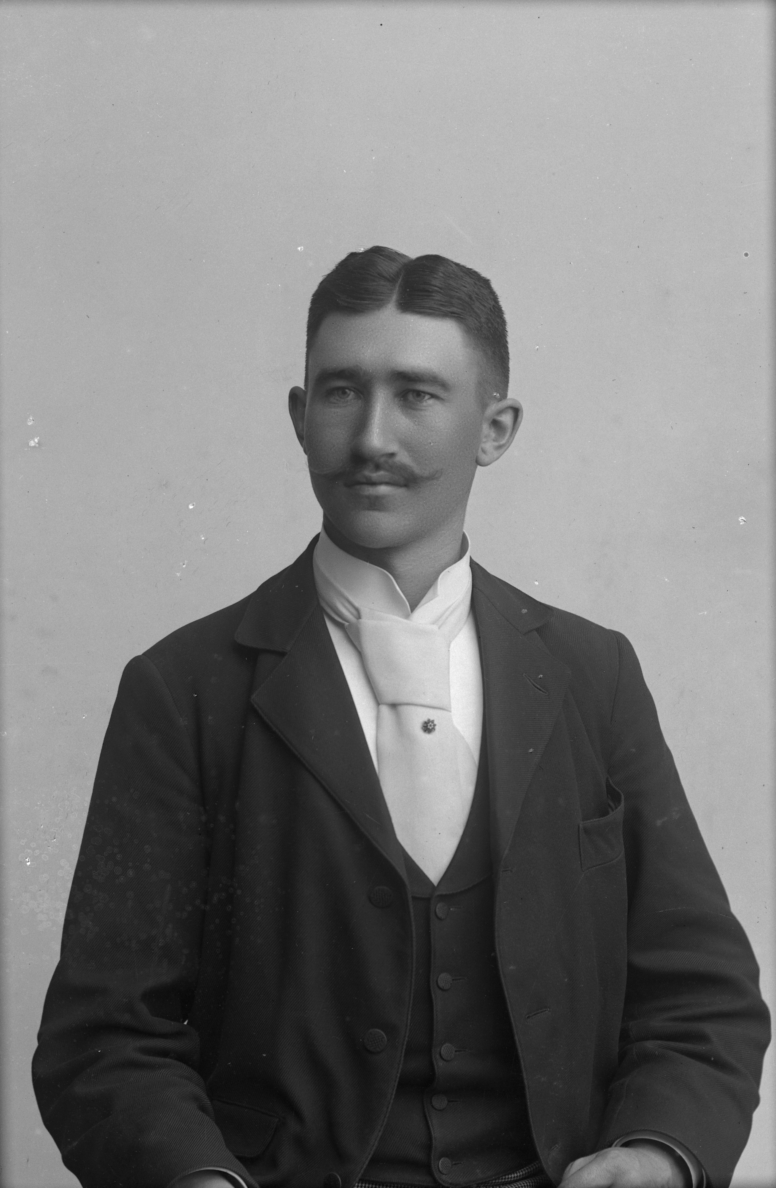 Beskrivning: Porträtt i halvfigur av verkmästare Waldemar Dehn vid Jordberga Sockerbruk.