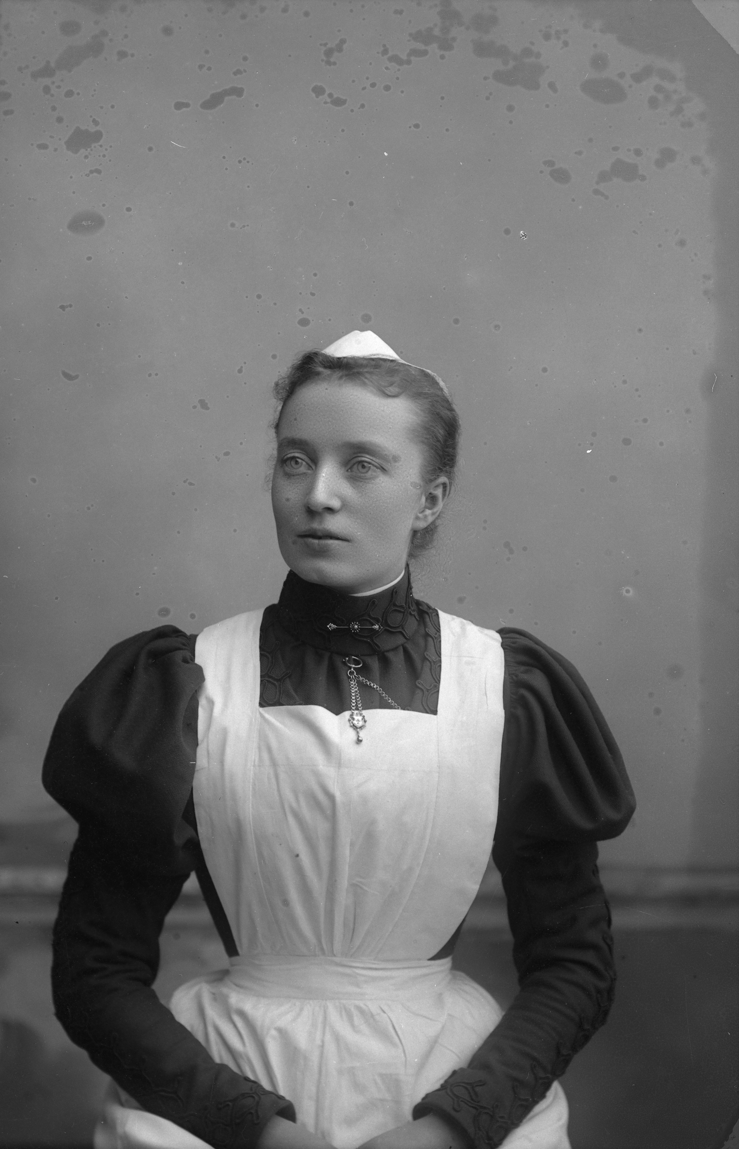 Porträtt i halvfigur av Annette Nilsson, iklädd sjusköterskeuniform.