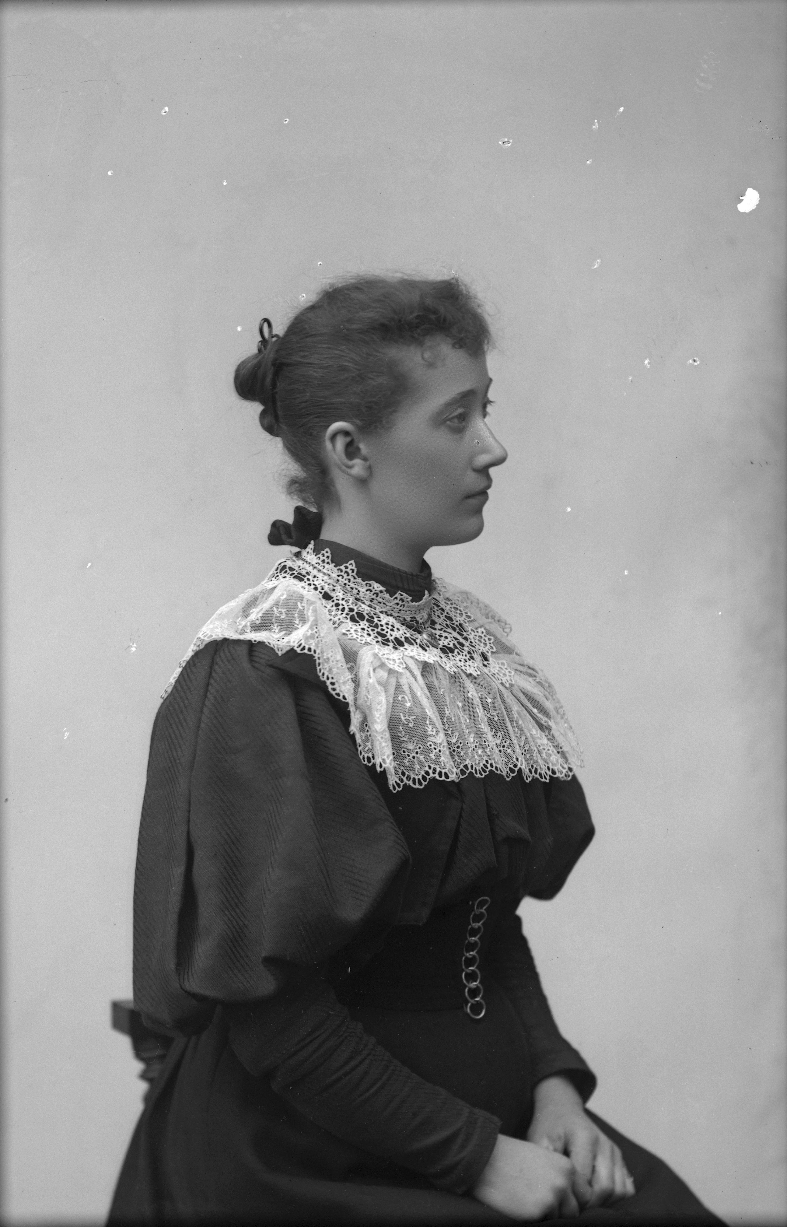 Porträtt i halvfigur, profil, av småskollärarinnan Bothilda "Thilda" Larsson.