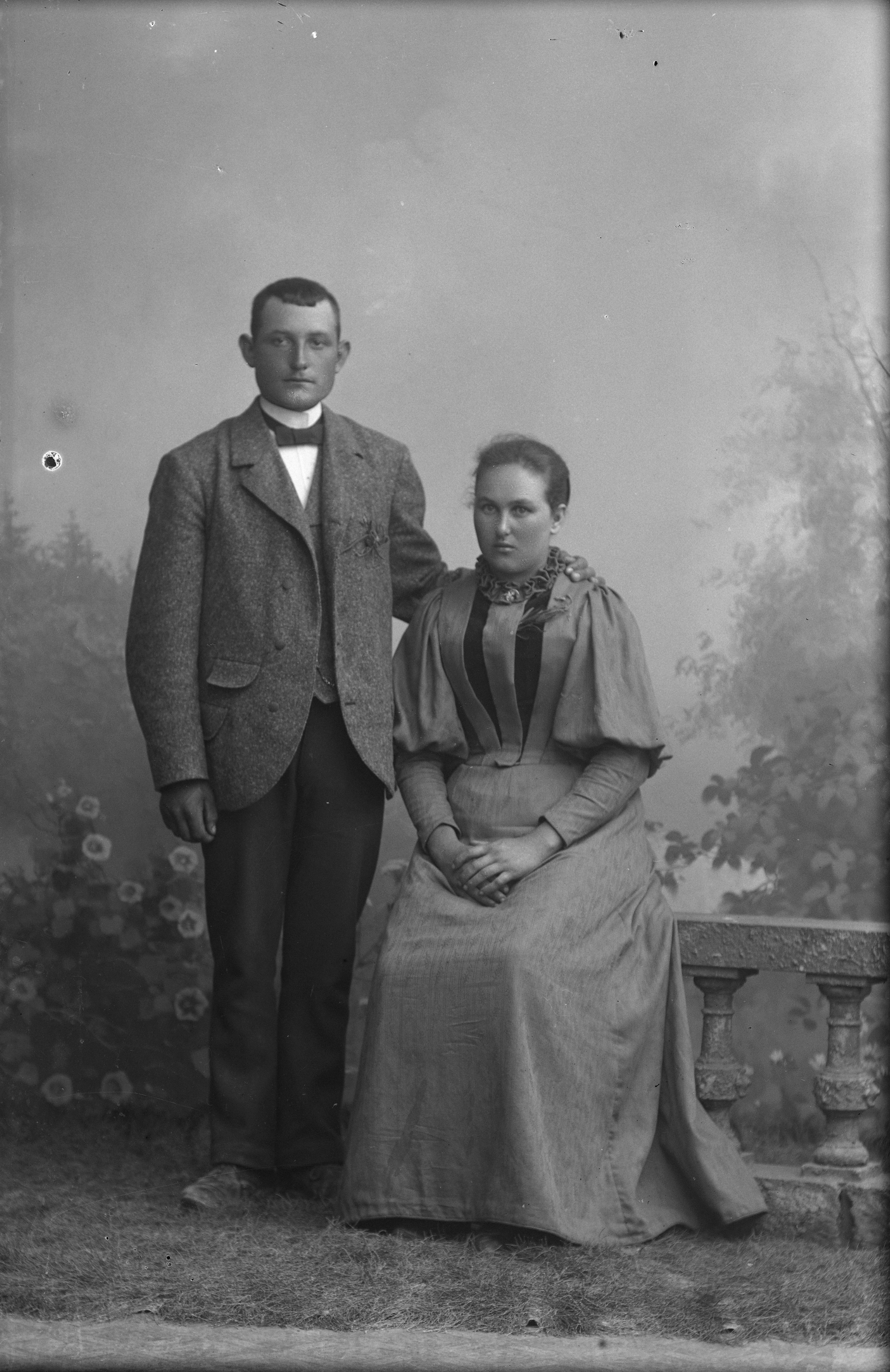 Porträtt i helfigur av drängen Karl Håkansson med frun Anette. Frun sittande på stenstaket med balustrad. Fotograferade framför ateljéfond med skogs- och blomstermotiv.