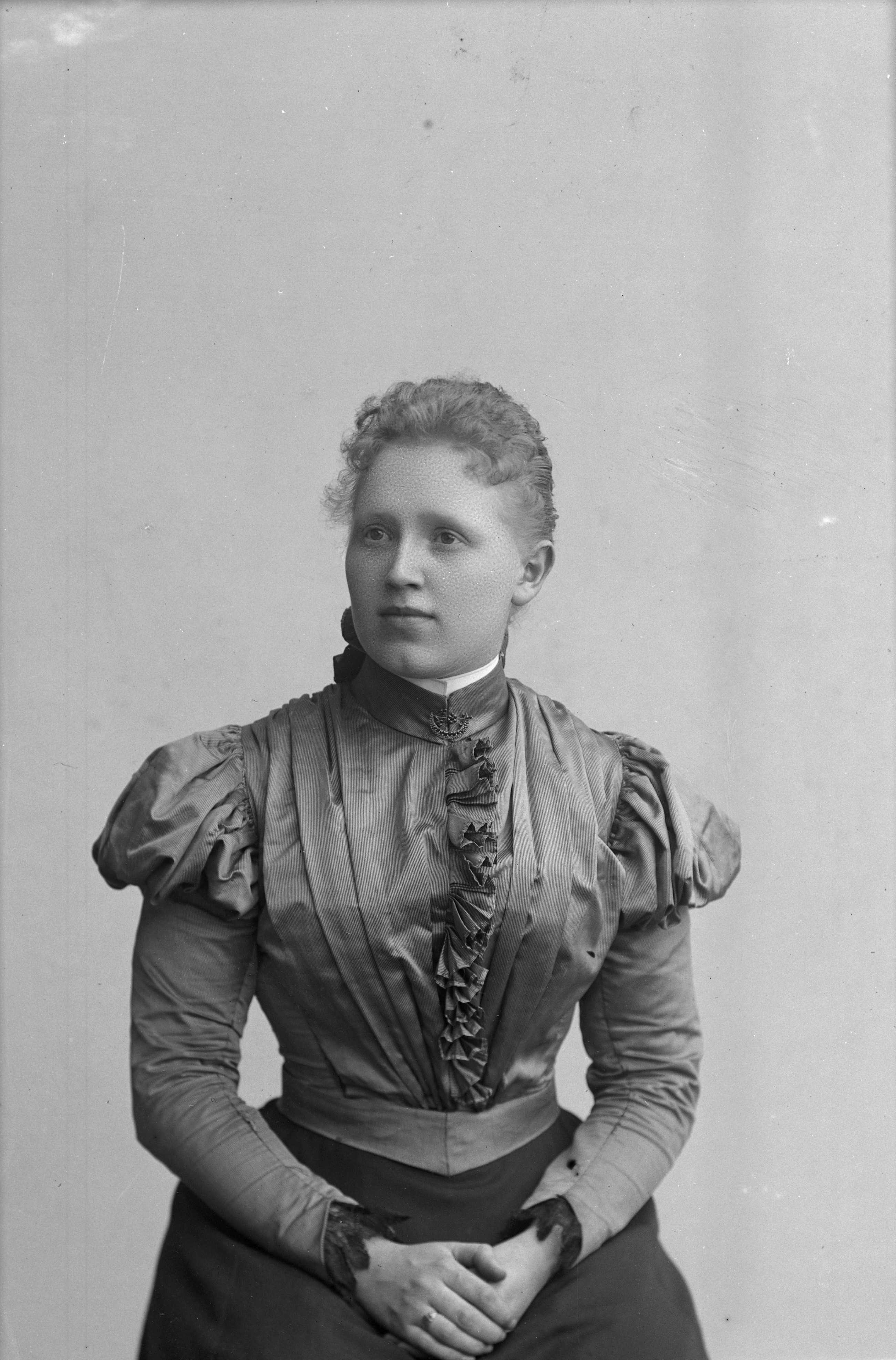 Beskrivning: Porträtt i halvfigur av Hilda Larsson i Anderslöv.