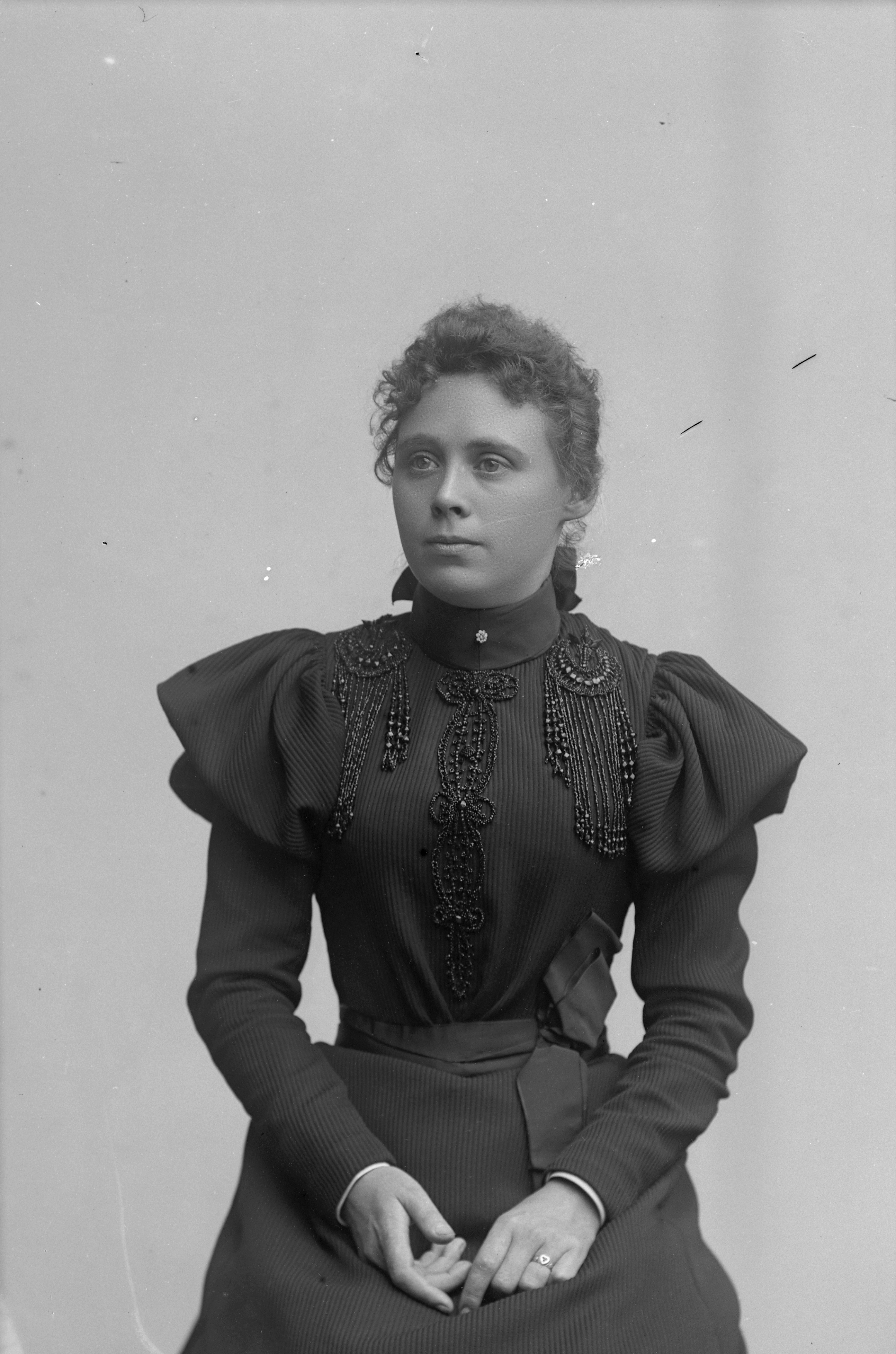 Beskrivning: Porträtt i halvfigur av Betty Larsson.