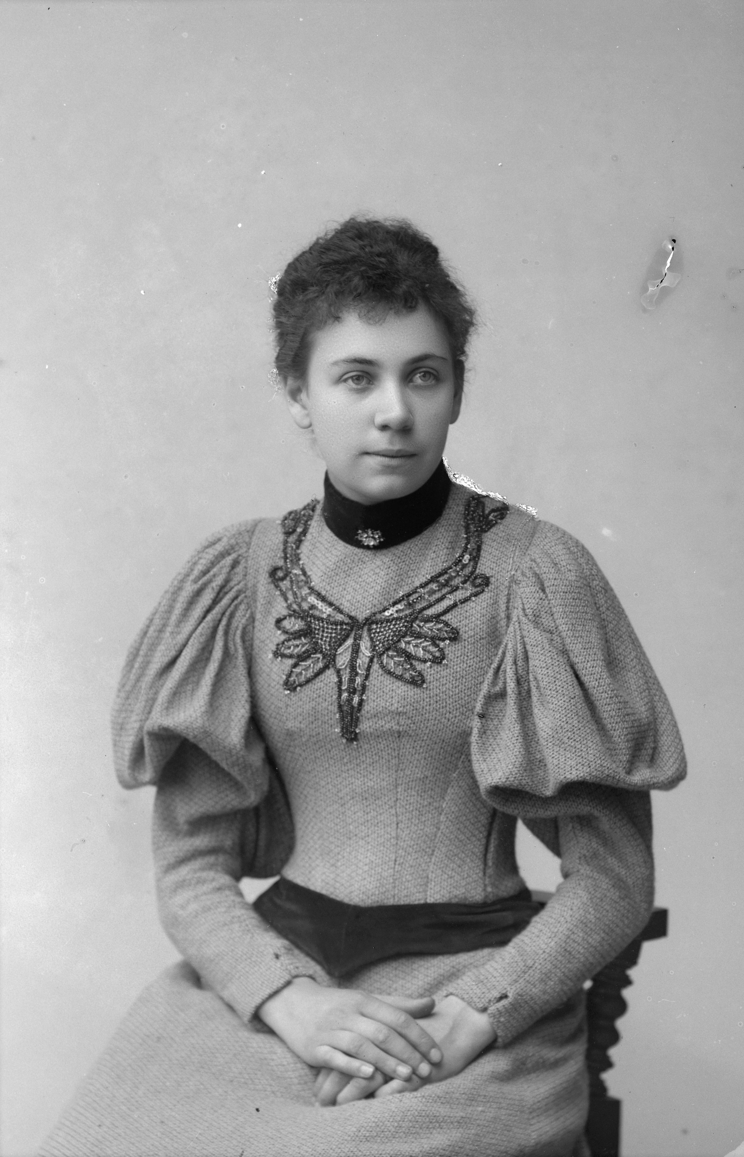 Beskrivning: Porträtt i halvfigur av Hilda Jönsson.