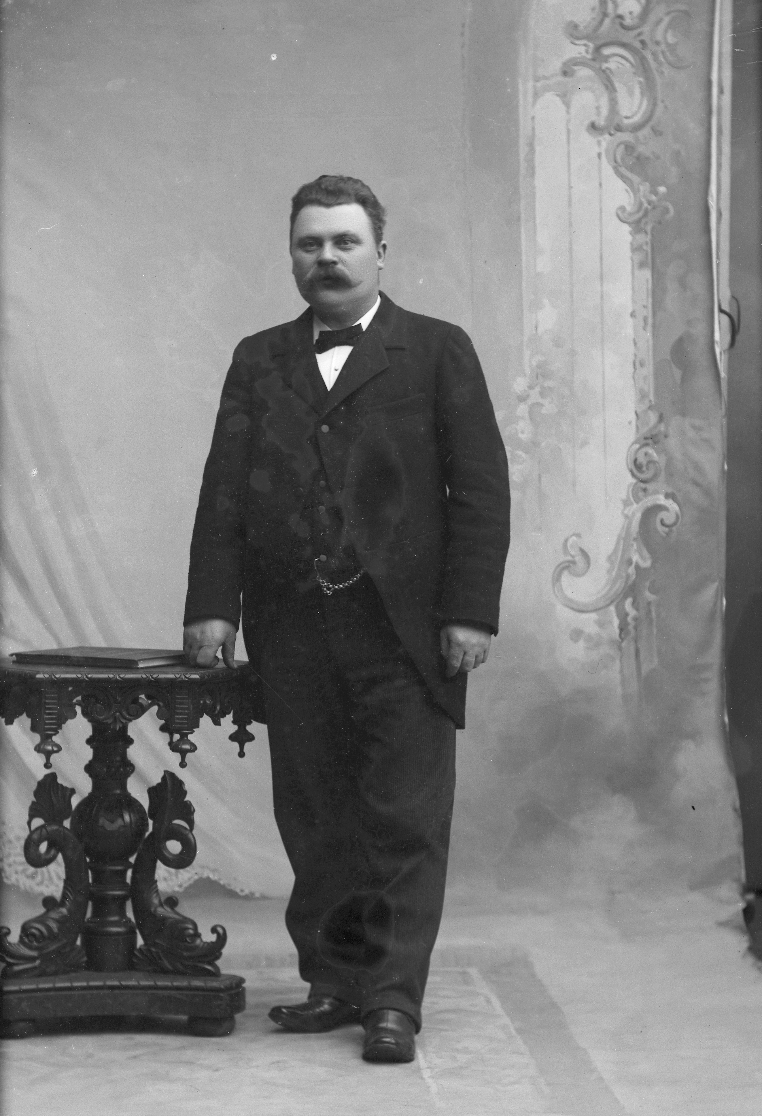 Porträtt i helfigur av trädgårdsmästare Möller, stående vid skulpterat pelarbord.
