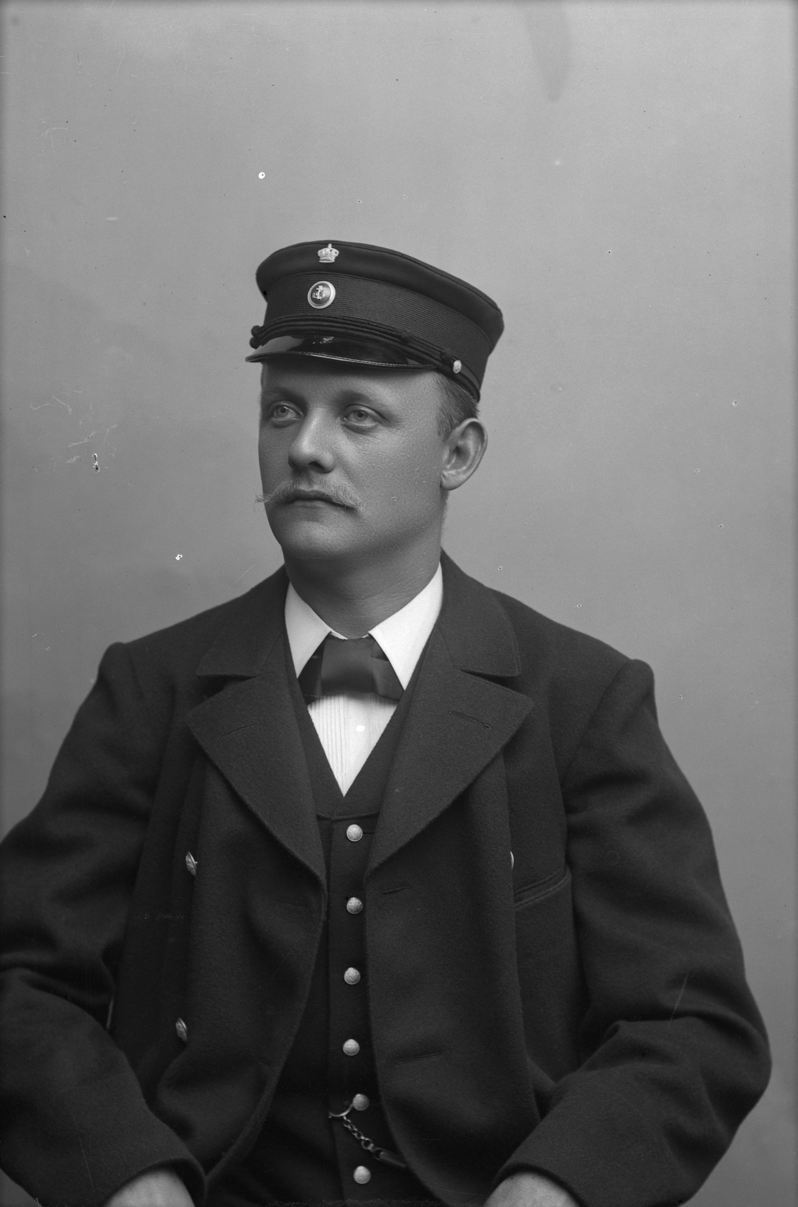 Porträtt i halvfigur av E. Andersson, iklädd SJ-uniform och skärmmössa med emblem.