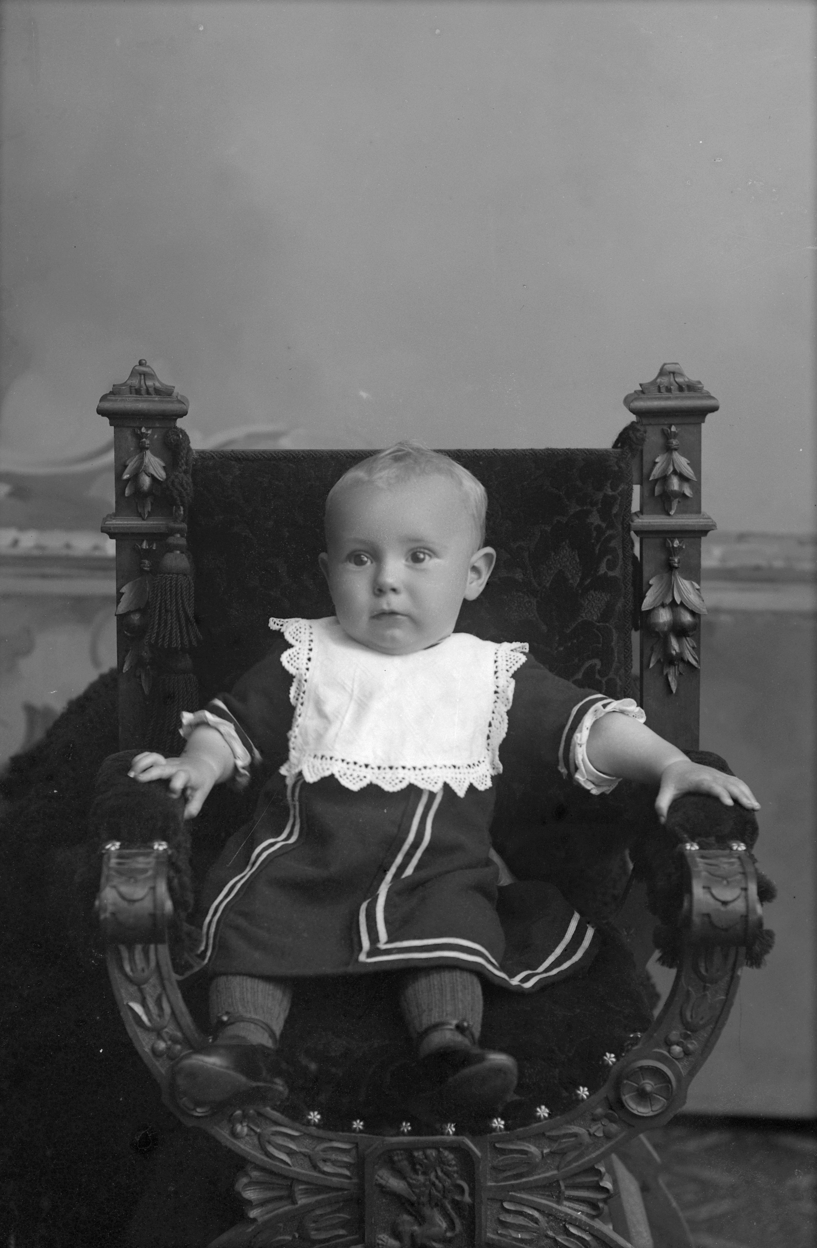 Porträtt i helfigur av fru Perssons dotter, sittande i stol.
