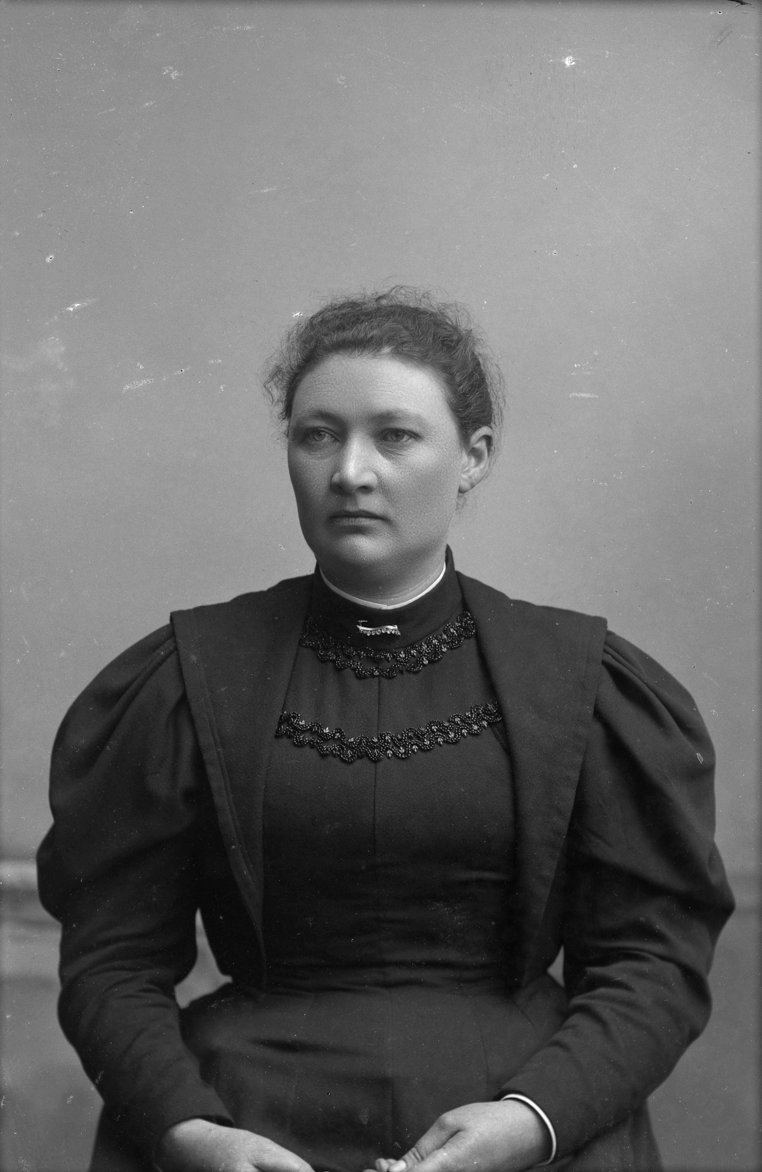 Beskrivning: Porträtt i halvfigur av fru Larsson.
