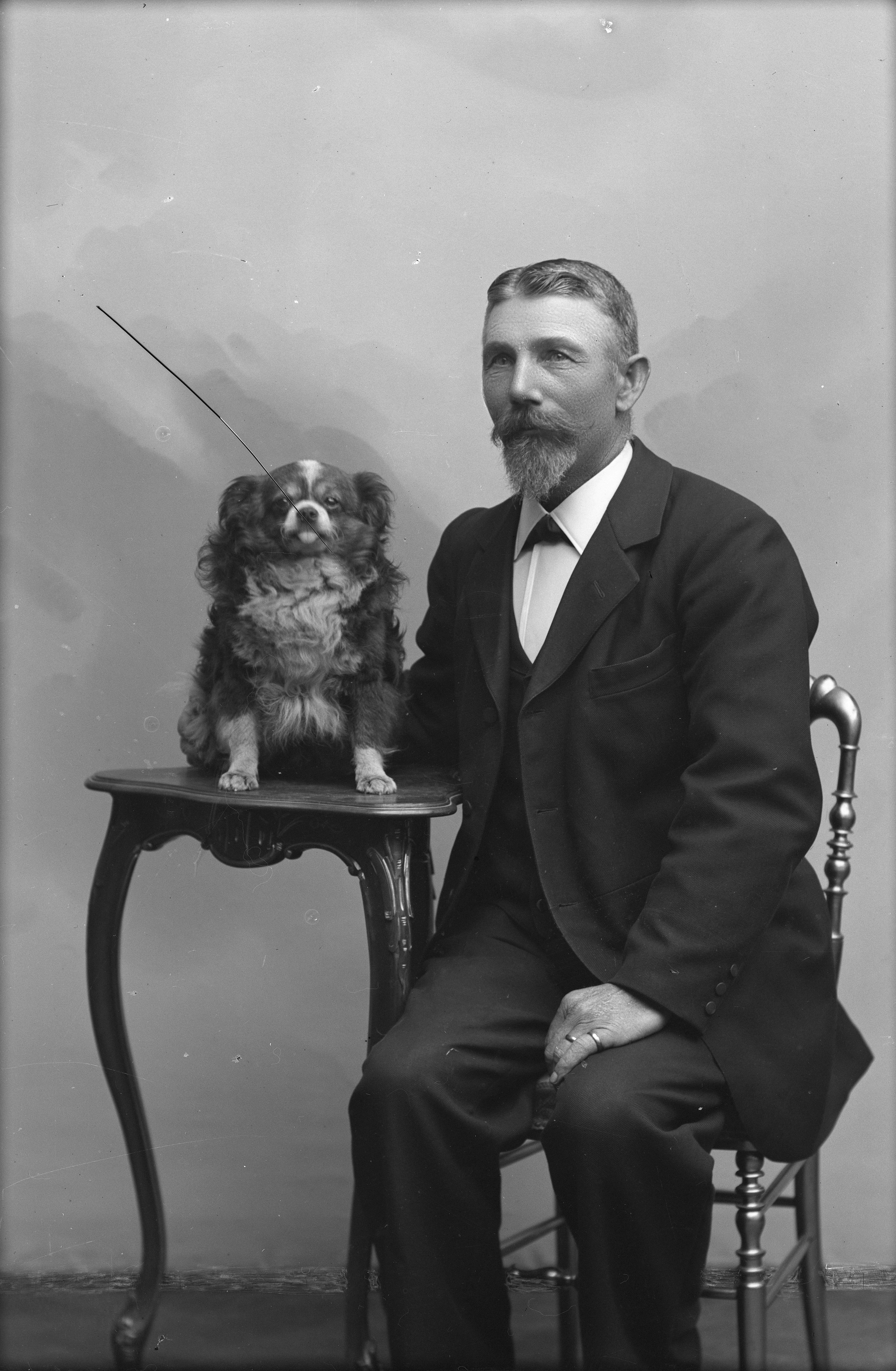 Porträtt i helfigur av A Nilsson, sittande vid bord. Hans hund sitter på bordet.