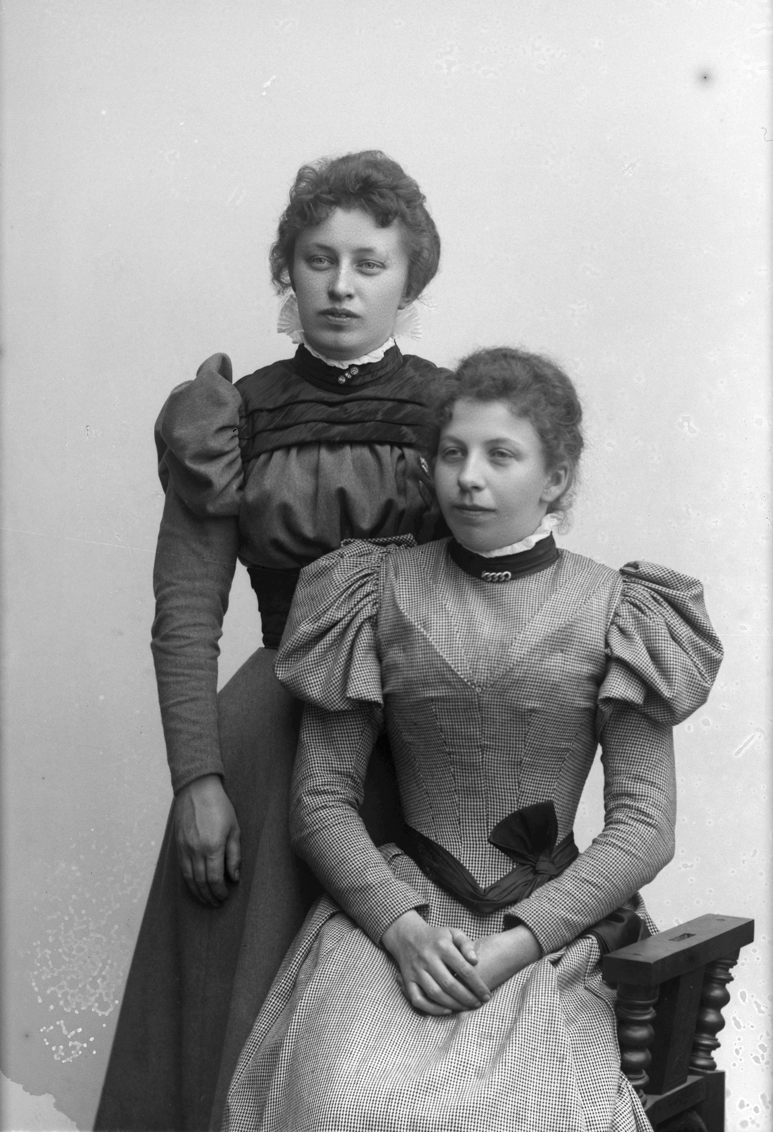 Beskrivning: Porträtt i helfigur av Ester Olander med okänd kvinna. Ester Olander stående /Djäknegatan.