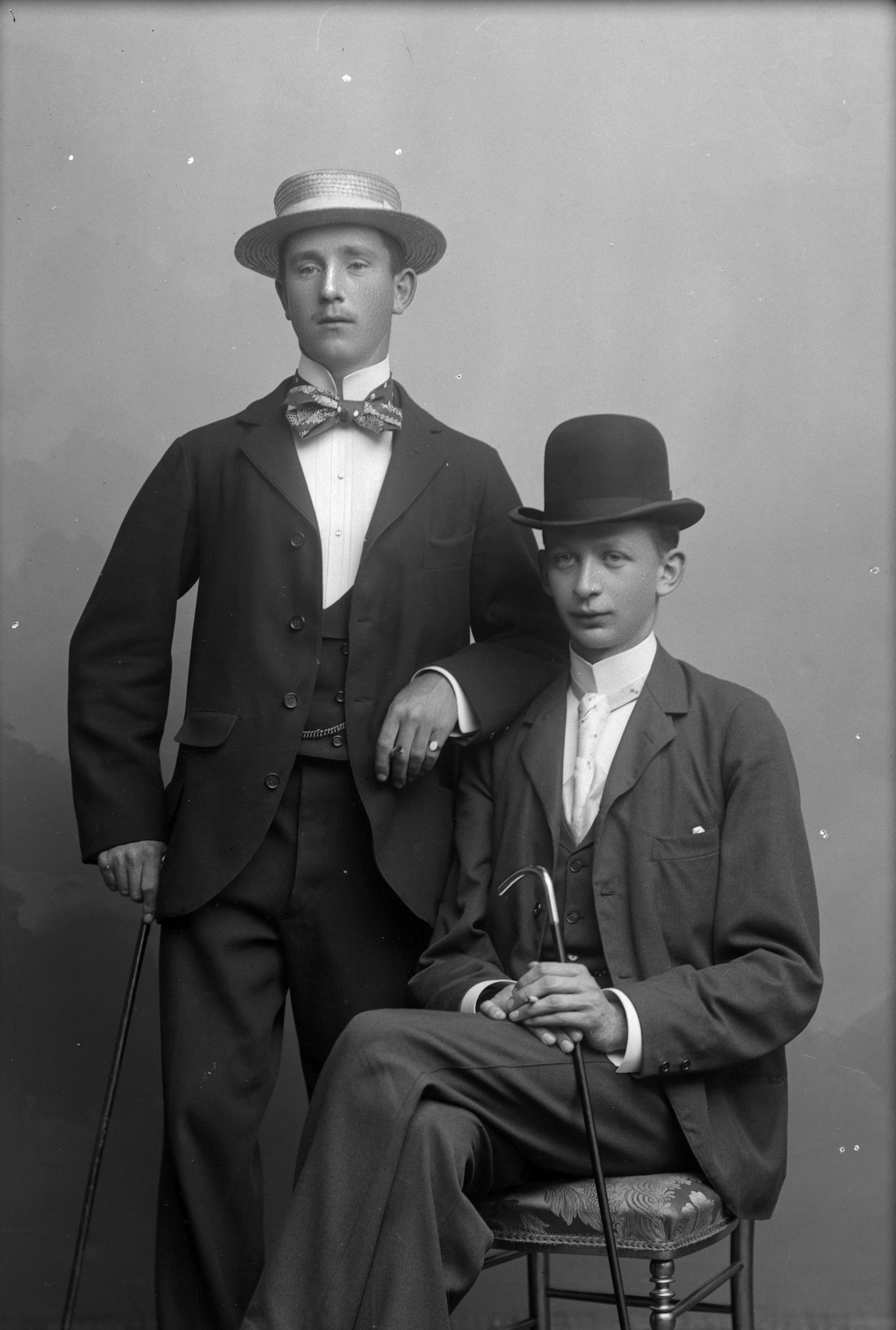 Porträtt i helfigur av C. Ekelund med okänd man, båda iklädda hattar, den ene mannen hållande käpp.